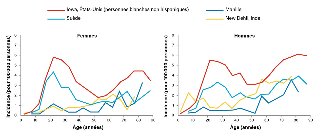 Une analyse de l’incidence du LH sur le pourtour méditerranéen montre des variations importantes parmi les pays étudiés dont les statuts socioéconomiques sont différents.1 L’incidence est décrite comme « bimodale », avec un pic chez l’adulte jeune – proche de 30 ans –, puis un second pic chez les individus plus âgés – proche de 70 ans. En analysant l’incidence des LH à Singapour sur deux périodes différentes, de 1968 à 1977 et de 1996 à 2004, Hjalgrim et al. ont montré que l’incidence du LH s’est grandement modifiée avec l’apparition du fameux pic d’incidence chez l’adulte jeune alors qu’il n’était pas présent sur la première période.2 Cette observation est à mettre en parallèle avec des modifications du mode de vie de type occidental à Singapour. Ces données décrites également pour d’autres pays par le Centre international de recherche sur le cancer (CIRC) confortent l’influence de facteurs environnementaux (fig. 1 ).3 Toutefois, ces distributions épidémiologiques demandent à être mieux comprises pour identifier les agents étiologiques qui sous-tendent ces différences.