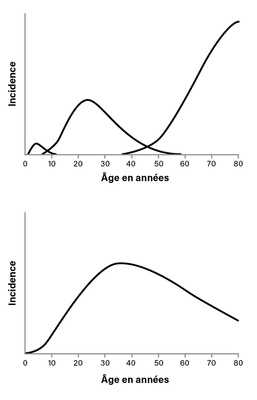 L’intégration des données précédemment exposées permet de proposer un modèle à quatre entités selon Hjalgrim :5 les formes pédiatriques (avant 10 ans) de LH associées à l’EBV ; les formes du sujet âgé associées à l’EBV ; les formes du jeune adulte pouvant être associées à un antécédent de MNI avec une courbe d’incidence en fonction de l’âge à « trois bosses » (fig. 2 ) ; le LH non associé à l’EBV avec un pic d’incidence chez l’adulte jeune qui a finalement une courbe d’incidence unimodale. C’est pour cette dernière forme que pourrait être appliquée l’hypothèse « hygiéniste » avec une exposition retardée aux agents pathogènes. Cette proposition de modèle imposerait, dans les études biologiques sur le LH, d’analyser dans un premier temps l’association à l’EBV. En effet, les études biologiques récentes montrent un profil immunologique des cellules du micro-environnement tumoral très différent entre les formes de LH associées ou non à l’EBV. Les LH EBV+ sont ainsi associés à une réponse immunologique de type Th1 avec la présence de lymphocytes CD8+ ; les LH EBV- ont, en revanche, une réponse de type Th17 impliquant les interleukines IL-17 et IL-23. De futures études biologiques restent à effectuer pour mieux faire le lien entre les données épidémiologiques et la physiopathologie du LH.