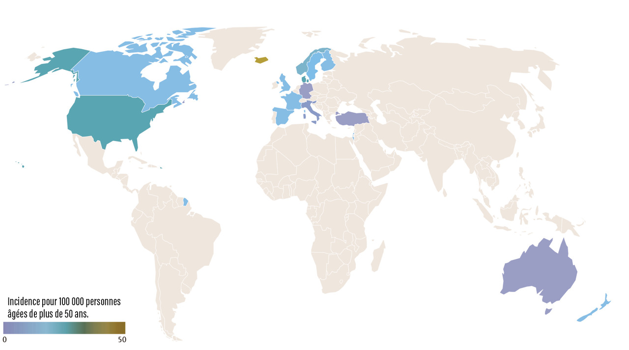 L’incidence de l’ACG suit un gradient Nord-Sud (fig. 1 ). La prévalence la plus élevée est observée dans les pays scandinaves et dans le comté d’Olmsted (Minnesota, États-Unis) où les populations ont une origine ethnique similaire. L’incidence annuelle y atteint 18,8 cas pour 100 000 personnes âgées de plus de 50 ans, ce qui suggère que la survenue de l’ACG est favorisée par des facteurs génétiques.4