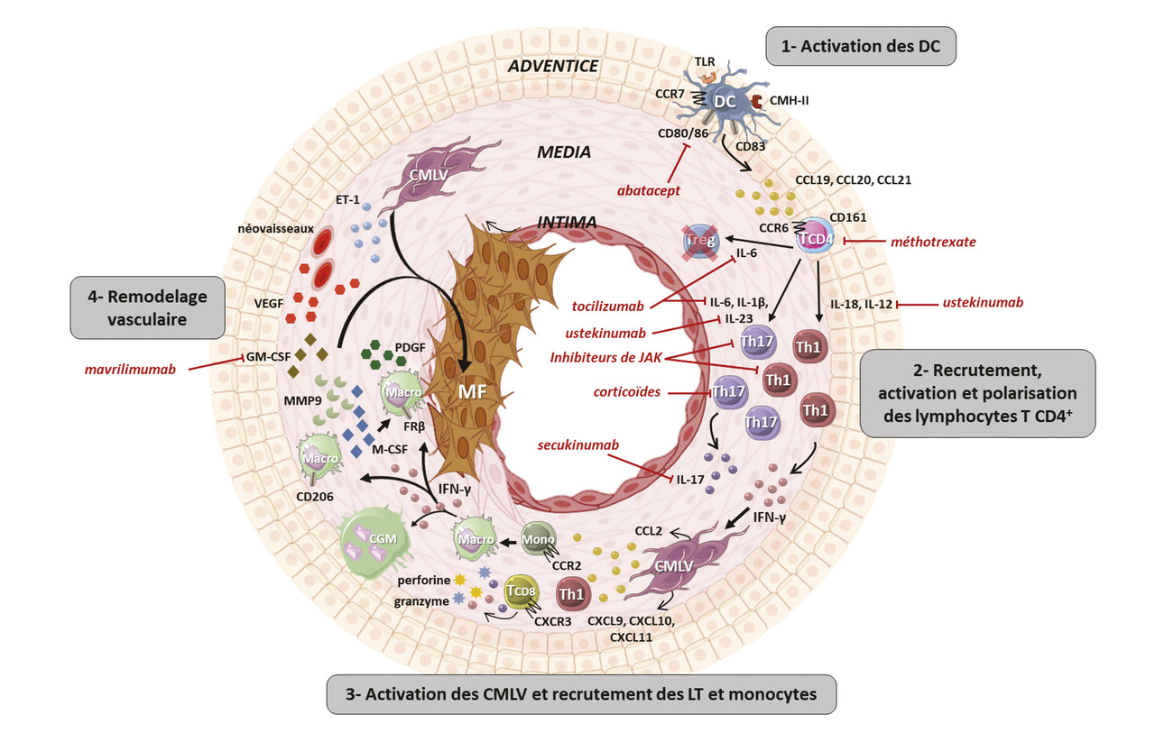 La dernière étape est celle du remodelage vasculaire conduisant au rétrécissement progressif de la lumière vasculaire dans les artères touchées et à l’apparition des signes ischémiques de l’ACG. Le remodelage vasculaire se caractérise par la destruction de la média et l’apparition d’une néo-intima hyperplasique composée de myofibroblastes et de protéines de la matrice extracellulaire, qui aboutit à la sténose, voire à l’occlusion de la lumière artérielle.2Les macrophages activés par l’IFN-γ et les CMLV jouent un rôle essentiel dans le remodelage vasculaire en favorisant l’angiogenèse via la production de facteur de croissance endothélial vasculaire (VEGF), la destruction des tissus via la production de métalloprotéases matricielles (MMP), en particulier MMP-9, et l’hyperplasie intimale via l’activation de la migration des CMLV de la média vers l’intima où elles deviennent des myofibroblastes qui y prolifèrent et produisent des protéines matricielles (collagène, fibronectine) sous l’influence du PDGF, l’endothéline 1 (ET-1) et d’autres facteurs non détaillés ici.4