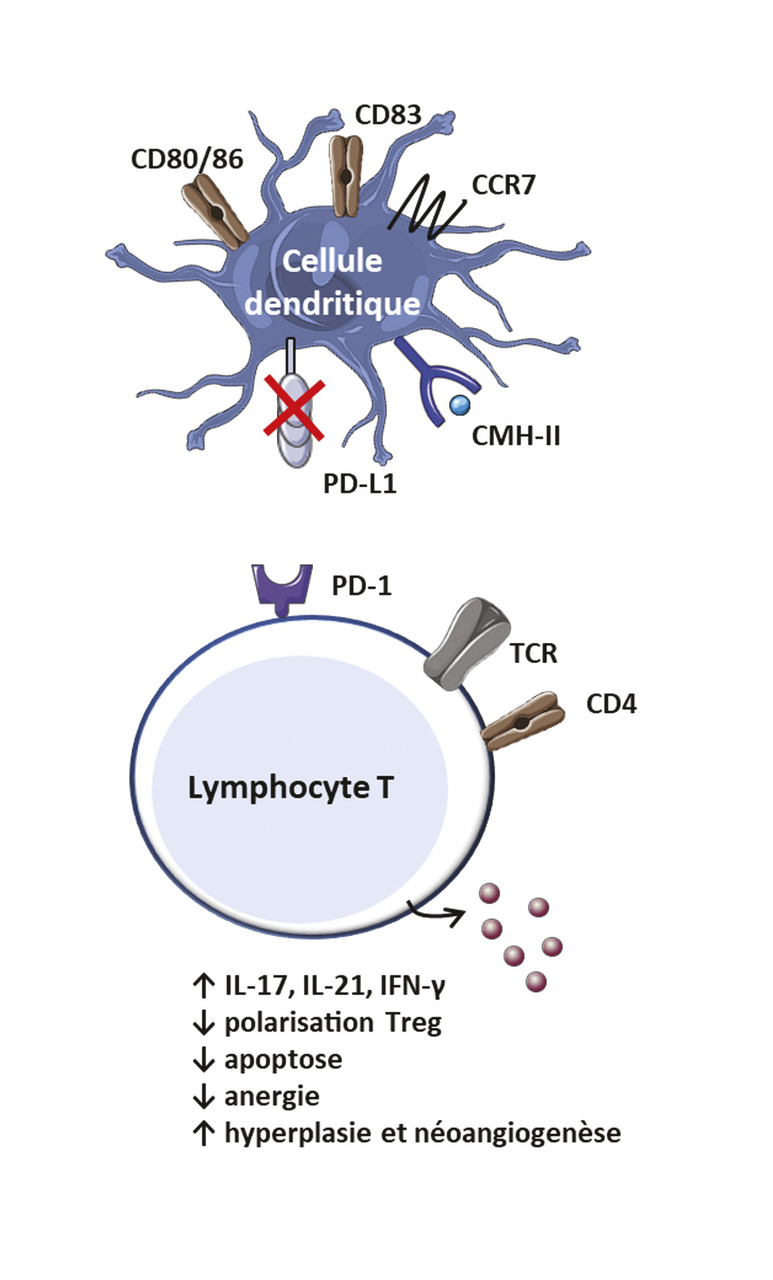 Un déficit au niveau du point de contrôle immunitaire PD-1/PD-L1 a été mis en évidence au cours de l’ACG. Programmed death 1 (PD-1) est une protéine de surface exprimée par les lymphocytes T activés et sa liaison à son ligand (PD-L1 [programmed death ligand] ou PD-L2), exprimé par les cellules présentatrices d’antigènes, induit la production d’IL-10, l’apoptose, l’anergie ou la polarisation des lymphocytes T en Treg. Ce système a donc une fonction immunosuppressive. Au cours de l’ACG, l’expression de PD-L1 par les cellules dendritiques est plus faible que chez les sujets sains, ce qui conduit à un défaut d’inhibition des lymphocytes T effecteurs PD-1+, producteurs d’IL-17, d’IL-21 et d’IFN-γ (fig. 4 ).16