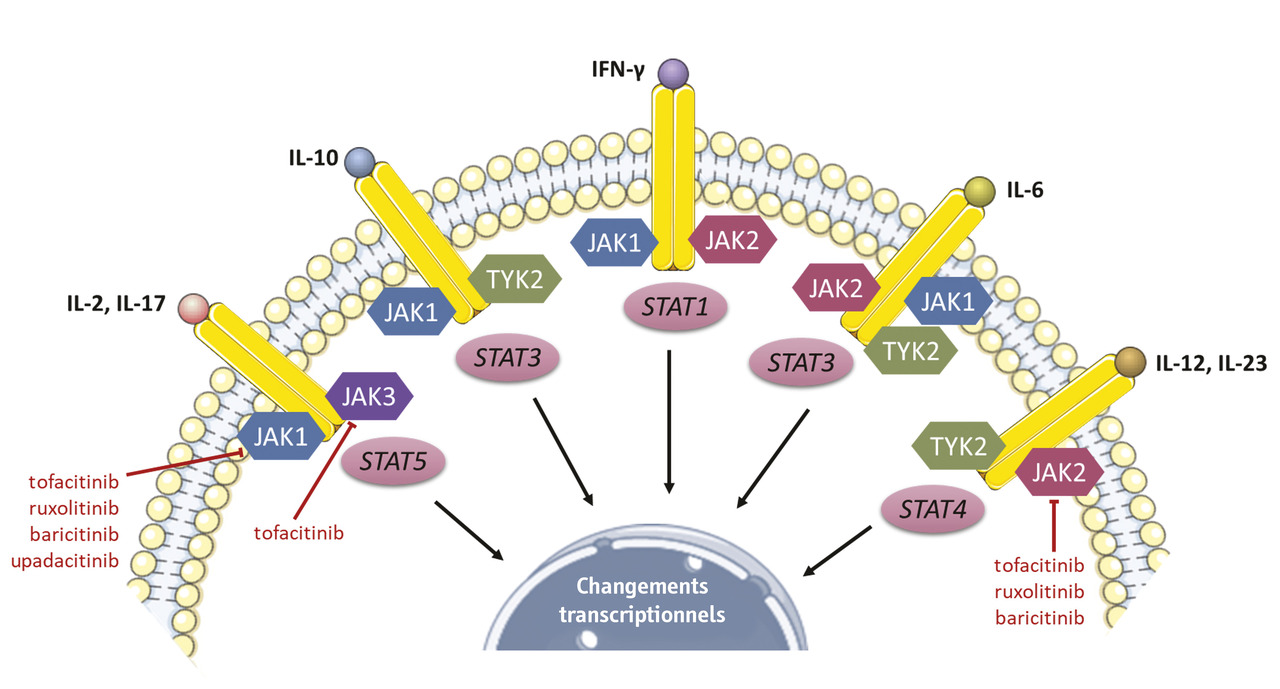 Ces dernières années, des progrès majeurs ont été faits dans la connaissance de la physiopathologie de l’ACG. Si le facteur déclenchant de la maladie n’est pas encore clairement identifié, les mécanismes impliqués dans l’inflammation et le remodelage vasculaire sont de mieux en mieux connus et ont permis d’identifier de nouvelles cibles thérapeutiques : l’activation du lymphocyte T (méthotrexate, abatacept), l’IL-6 (tocilizumab), l’IL-17 (sécukinumab), l’IL-12/23 (ustékinumab), le GM-CSF (mavrilimumab) ou les inhibiteurs des JAK (fig. 6 ), des protéines kinases redondantes et impliquées dans la signalisation de multiples cytokines (liste non exhaustive).