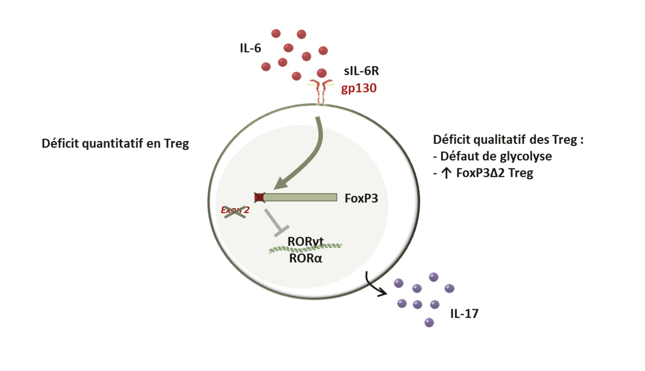 Les lymphocytes Treg jouent un rôle majeur dans les mécanismes de tolérance en raison de leur fonction immunosuppressive. Les Treg sont des cellules suppressives classiquement définies par une forte expression de la chaîne α de l’IL-2 (CD25) et du facteur de transcription FoxP3. Les Treg jouent un rôle décisif dans le maintien de la tolérance vis-à-vis du soi. Ils exercent leur fonction suppressive sur l’activation, la prolifération et les fonctions effectrices de l’ensemble des cellules immunitaires, et en tout premier lieu sur les lymphocytes T. Au cours de l’ACG, il existe un déficit quantitatif en lymphocytes Treg (CD4+CD25highFoxP3+) dans le sang des patients, comparativement à des sujets sains du même âge. De plus, les Treg sont absents des lésions artérielles d’ACG.11 Enfin, plusieurs études ont montré que la fonction immunosuppressive des Treg était altérée au cours de l’ACG comparativement à des sujets sains.17 Ce déficit quantitatif et fonctionnel des Treg au cours de l’ACG est lié à des défauts dans les mécanismes de la glycolyse, ainsi qu’à une augmentation de la proportion de Treg exprimant une isoforme hypofonctionnelle de FoxP3, dépourvue d’exon 2 (FoxP3Δ2), qui a une capacité d’immunosuppression altérée et produit des cytokines pro-inflammatoires comme l’IL-17.4, 17, 18 L’IL-6, qui est augmentée dans le sérum des patients atteints d’ACG, joue un rôle majeur dans l’altération de la réponse Treg au cours de l’ACG. En effet, le blocage de la signalisation de l’IL-6 par le tocilizumab, un anticorps monoclonal antirécepteur de l’IL-6, corrige le déficit quantitatif en Treg circulant, diminue la proportion de Treg déficients en exon 2 de FoxP3 et restaure une grande partie des fonctions immunosuppressives des Treg (