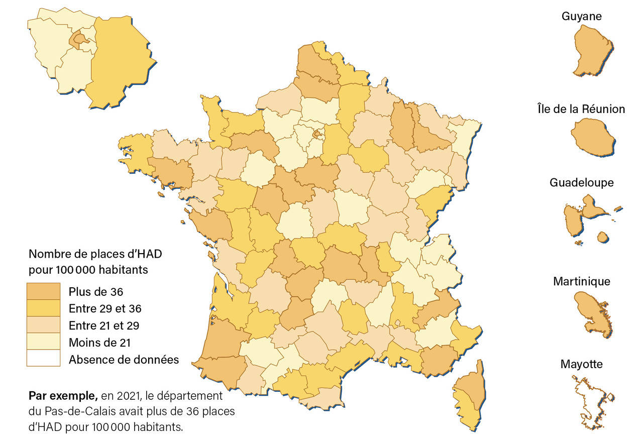 En ce qui concerne l’hospitalisation à domicile (HAD), il y avait, en 2021, 34 places pour 100 000 habitants (