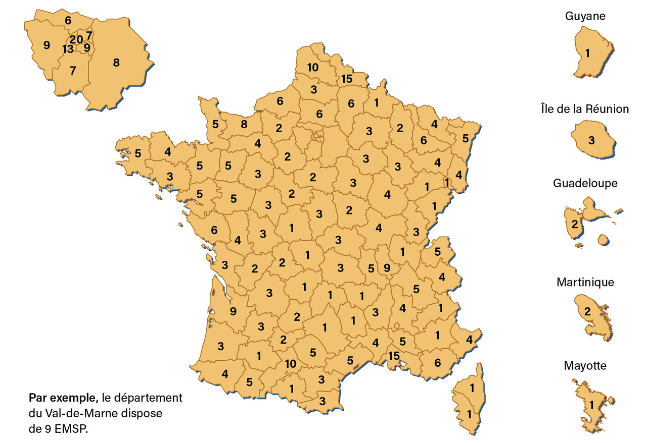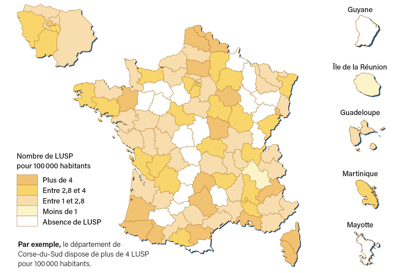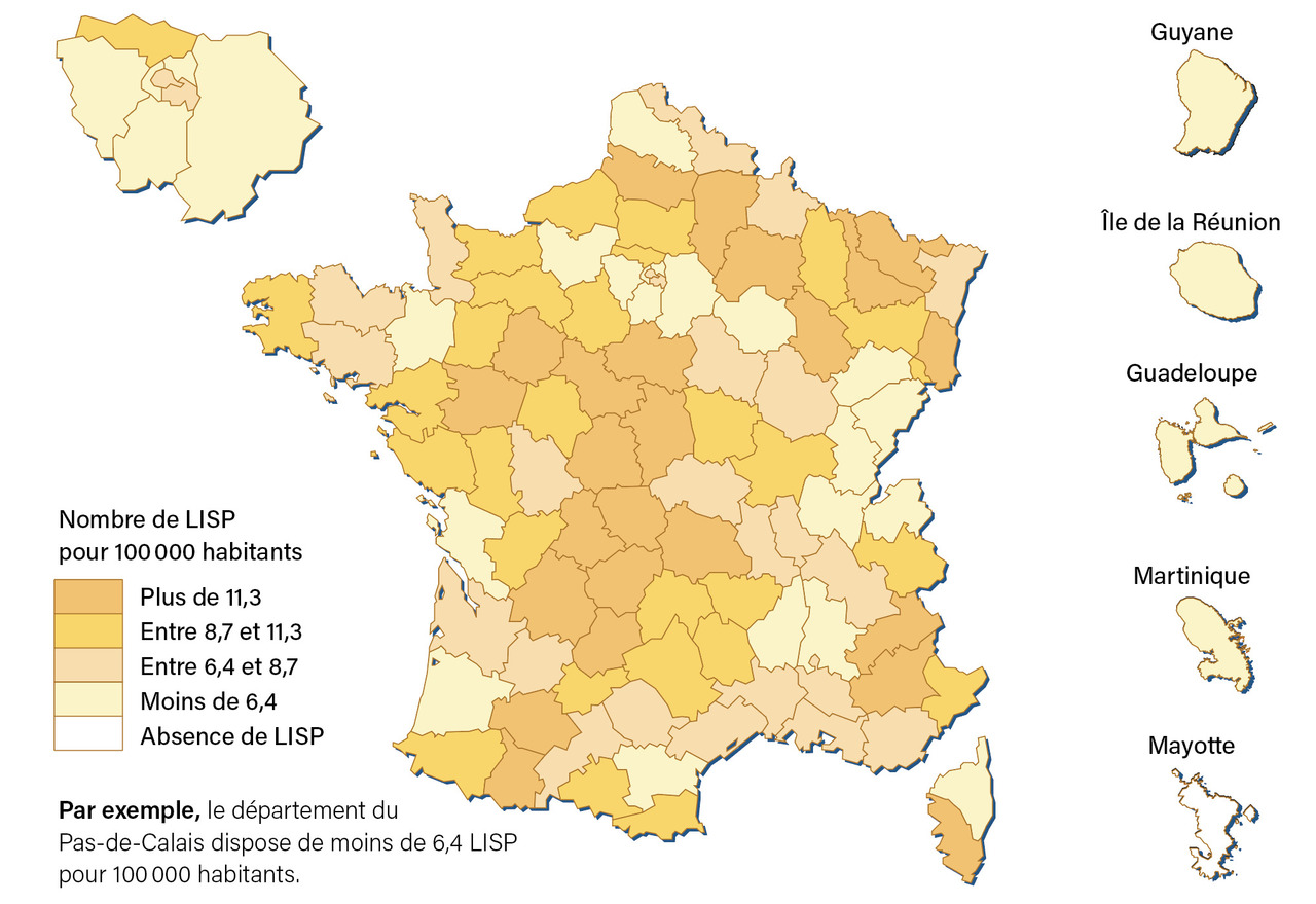 On dénombrait 904 établissements disposant de LISP, pour un total de 5 566 LISP soit 8,2 pour 100 000 habitants en France. Tous les départements français étaient dotés en LISP, excepté Mayotte (fig. 2 ).