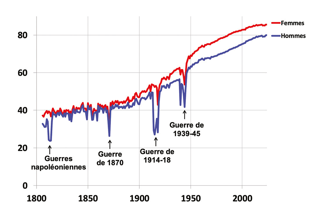 En conséquence, l’espérance de vie augmente (fig. 5). L’espérance de vie une année donnée, par exemple 2024, se calcule en prenant une population de 100 000 personnes et en la faisant mourir à chaque âge comme la population française de cet âge en 2024. La moyenne des durées de vie ainsi obtenue est l’espérance de vie. Cette figure montre que l’espérance de vie était d’environ 40 ans jusqu’au milieu du XIXe siècle et a ensuite augmenté pour atteindre, en 2024, 85,6 ans pour les femmes et 80 ans pour les hommes. La pandémie de Covid- 19 a temporairement arrêté l’augmentation de l’espérance de vie. Mais, en 2024, l’espérance vie des femmes a retrouvé le niveau de 2019 et l’espérance de vie des hommes a un peu dépassé le niveau de 2019. Certains prédisent que l’espérance de vie va bientôt cesser d’augmenter, mais on peut leur objecter que :