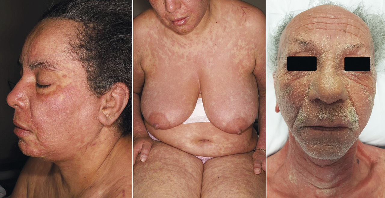 Les signes cliniques classiques des érythrodermies comprennent un érythème généralisé, inflammatoire, plus violacé aux zones déclives, d’intensité variable d’un jour à l’autre, et d’apparition plus ou moins rapide. On retrouve également une desquamation postinflammatoire (fine ou en larges lambeaux), un prurit, des épisodes d’hyperthermie et d’hypothermie par altération de la fonction barrière cutanée, un épaississement cutané diffus par infiltration cellulaire (pachydermie mieux visible aux plis), une polyadénopathie (dermopathique ou par infiltration cellulaire), un œdème souvent marqué du visage (avec ectropion), des troubles hémodynamiques avec déperditions hydroélectrolytiques et/ou protéiques, une altération de l’état général.D’autres symptômes peuvent s’y associer en fonction du diagnostic étiologique :