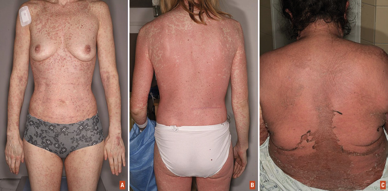 On distingue trois types de présentation clinique qui orientent le diagnostic chez l’adulte : exanthème roséoliforme, morbilliforme et scarlatiniforme (Devant un exanthème, il convient d’estimer la surface corporelle atteinte, sa localisation, et de rechercher les signes généraux (fièvre, altération de l’état général). La présence de signes extracutanés oriente le diagnostic : origine virale (fièvre, syndrome grippal, énanthème, polyadénopathie) et origine médicamenteuse (prurit, caractère polymorphe de l’éruption). Les signes de gravité indispensables à rechercher sont : l’œdème du visage, les adénopathies, la présence d’un signe de Nikolsky (décollement cutané provoqué par le frottement en peau saine) et les érosions muqueuses, qui orientent vers une toxidermie grave.