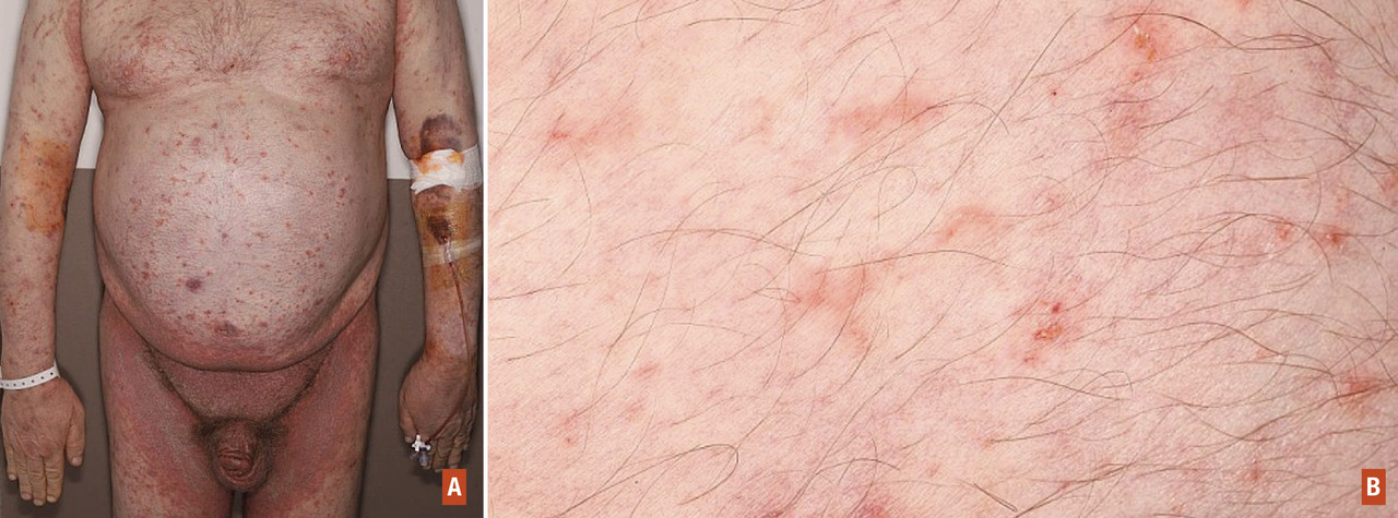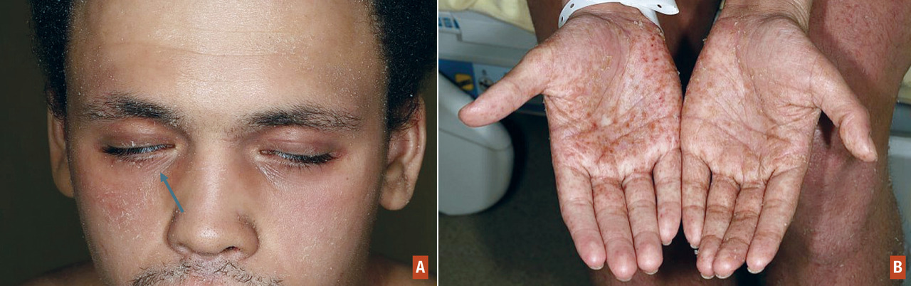 L’interrogatoire recherche la durée d’évolution de l’éruption, les antécédents dermatologiques et non dermatologiques, les prises médicamenteuses récentes, l’application de topique, les éventuels contages infectieux, les rapports sexuels non protégés et le prurit familial. La recherche de signes généraux associés est également indispensable : fièvre, sueurs nocturnes, anorexie.Clinique (fig. 5 à 9)