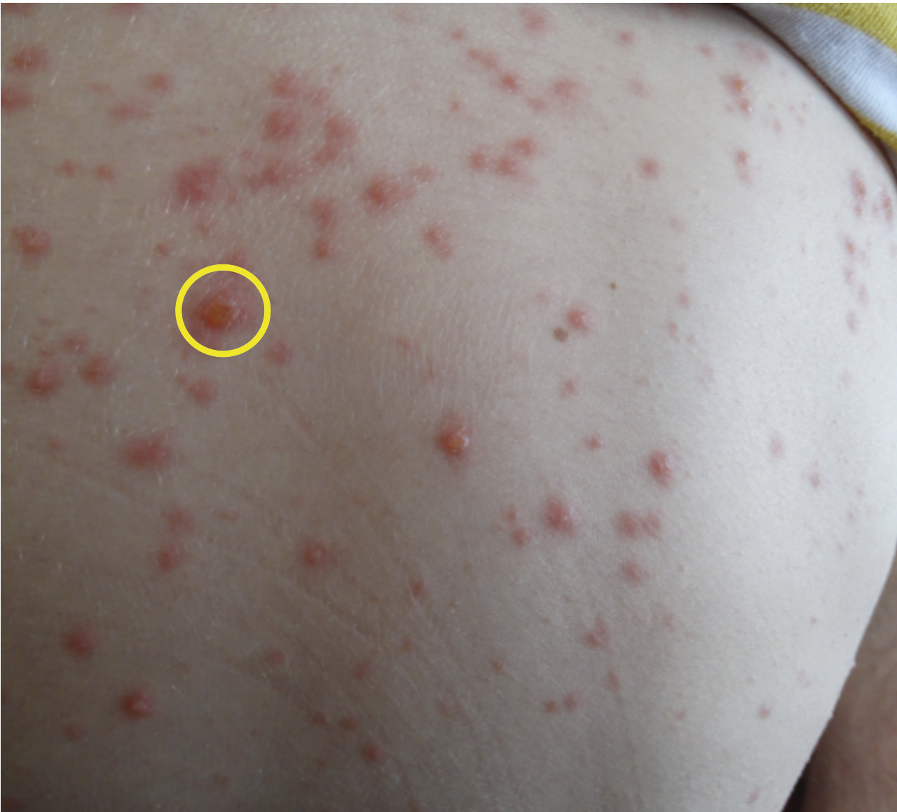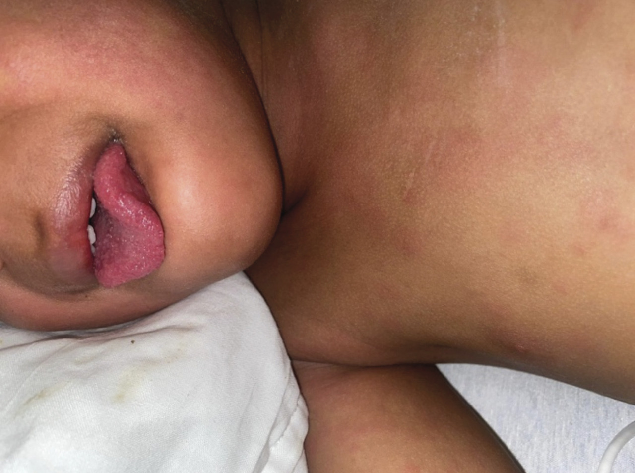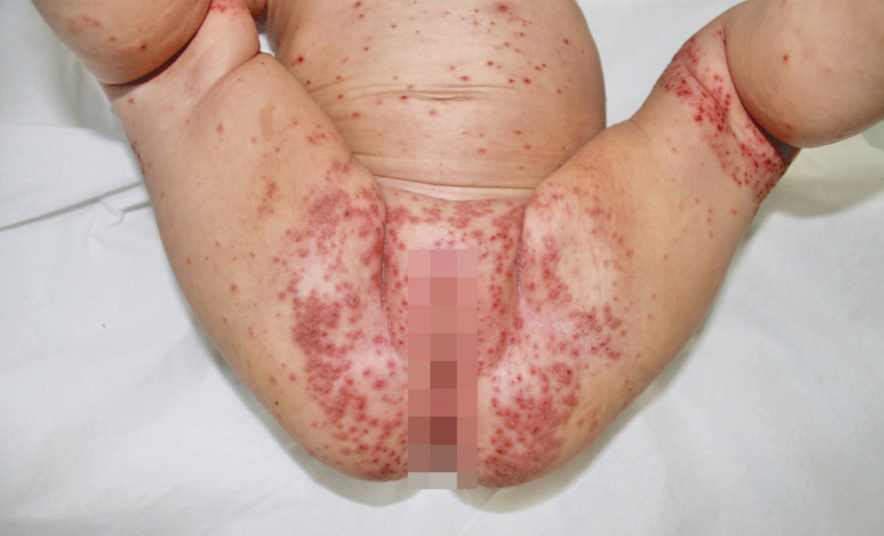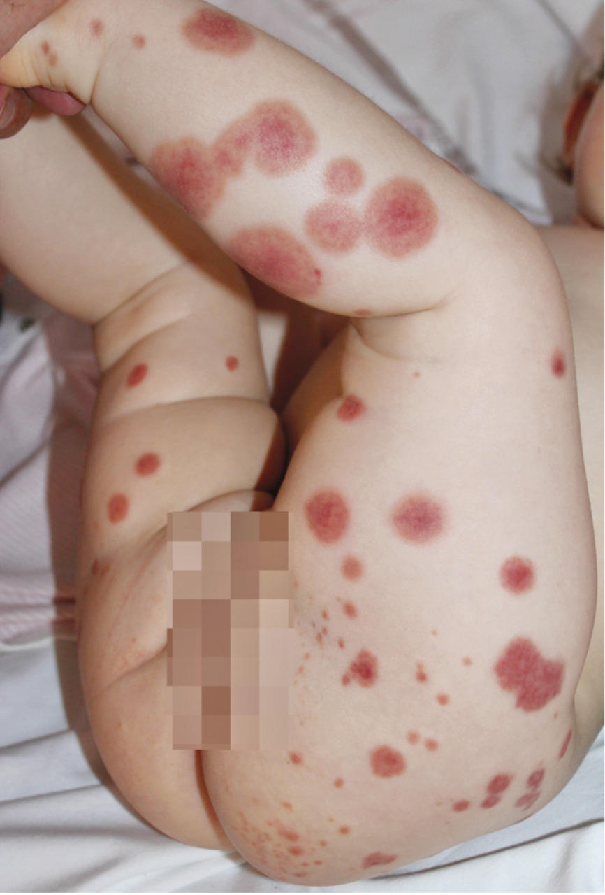 Le syndrome de Gianotti-Crosti est rencontré chez l’enfant généralement âgé de 1 à 6 ans. Il est associé au virus d’Epstein-Barr le plus souvent, mais également à de nombreux autres virus : hépatites B et A, cytomégalovirus, parvovirus, Coxsackies, etc.L’exanthème débute brutalement et est parfois précédé de prodromes à type de pharyngite, d’infection des voies aériennes supérieures ou de diarrhée. Il est constitué de papules ou de papulovésicules monomorphes de 1 à 5 mm de diamètre, de couleur rose à brun rouge, parfois discrètement prurigineuses et confluentes. Leur nombre est variable, allant de quelques dizaines à plusieurs centaines, disposées de manière bilatérale et symétrique sur les faces d’extensions des membres (coudes, genoux, extrémités), les fesses, les joues. Elles épargnent le tronc, les paumes et la zone médio-faciale.