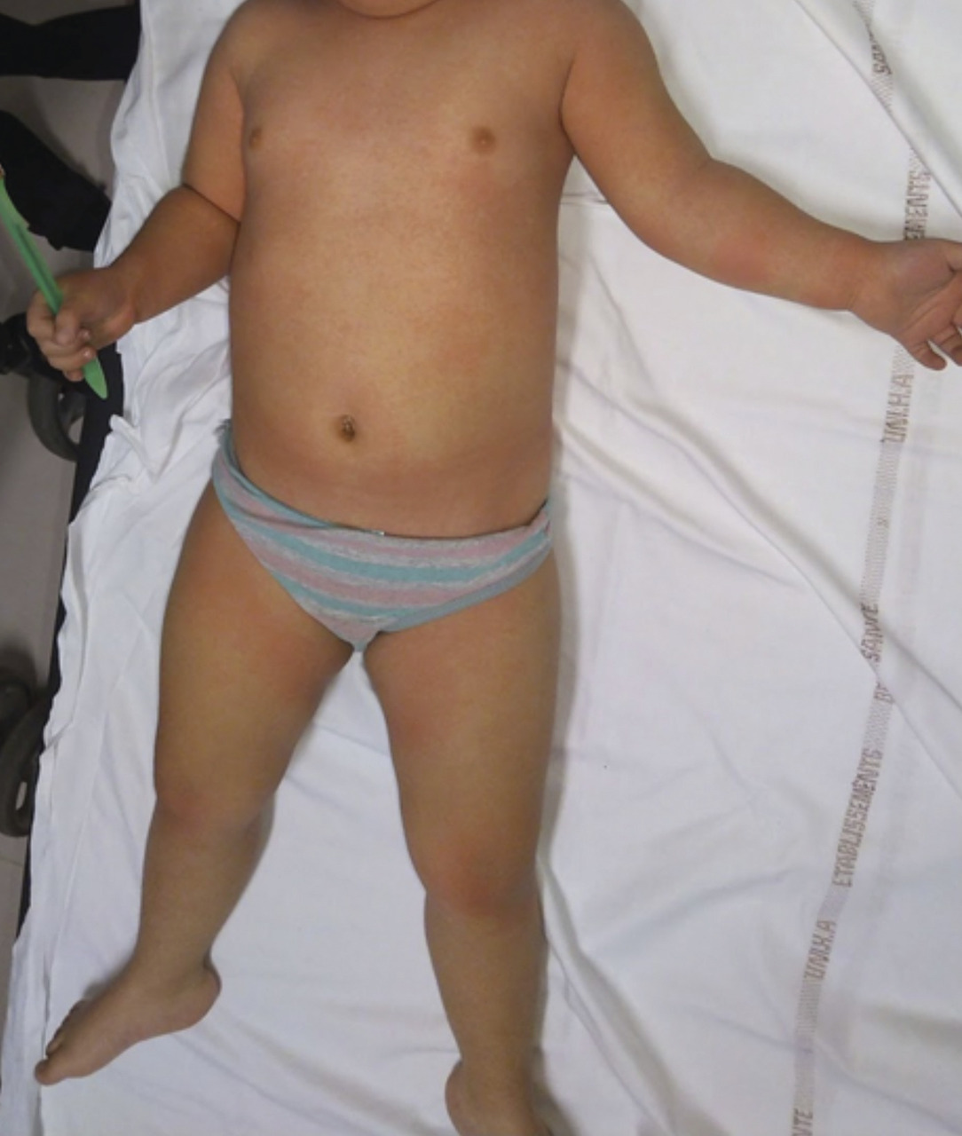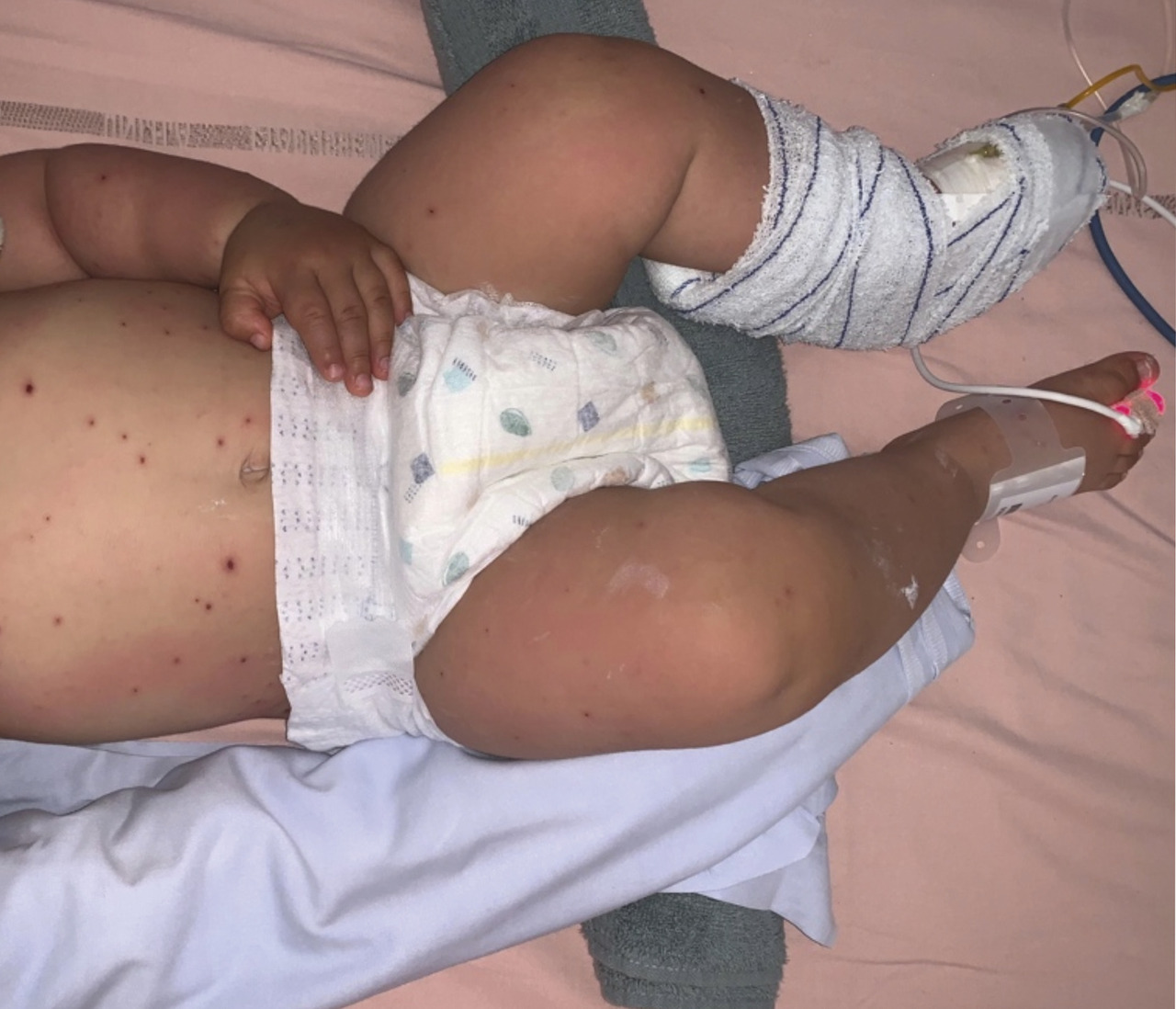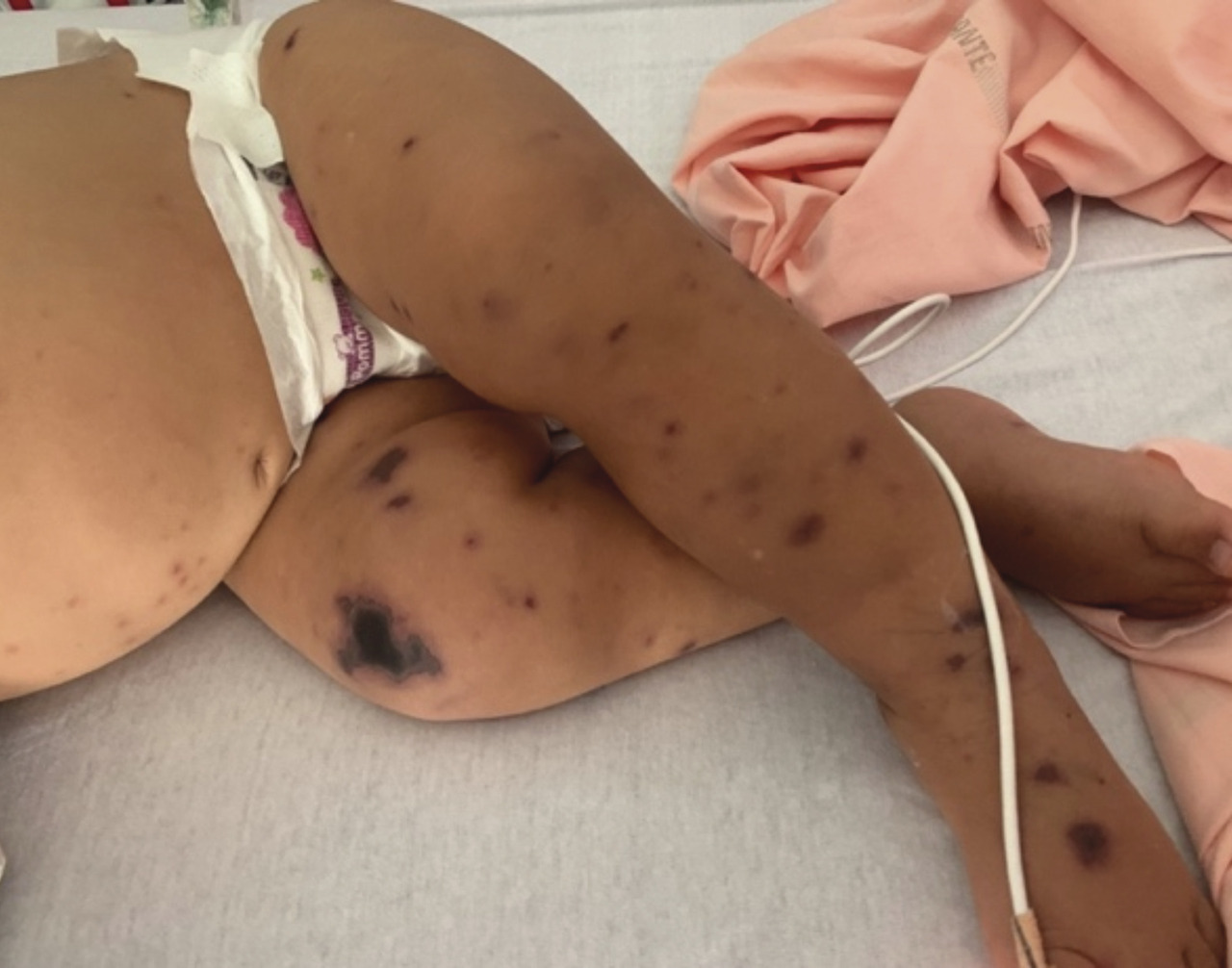 Le syndrome de Gianotti-Crosti est rencontré chez l’enfant généralement âgé de 1 à 6 ans. Il est associé au virus d’Epstein-Barr le plus souvent, mais également à de nombreux autres virus : hépatites B et A, cytomégalovirus, parvovirus, Coxsackies, etc.L’exanthème débute brutalement et est parfois précédé de prodromes à type de pharyngite, d’infection des voies aériennes supérieures ou de diarrhée. Il est constitué de papules ou de papulovésicules monomorphes de 1 à 5 mm de diamètre, de couleur rose à brun rouge, parfois discrètement prurigineuses et confluentes. Leur nombre est variable, allant de quelques dizaines à plusieurs centaines, disposées de manière bilatérale et symétrique sur les faces d’extensions des membres (coudes, genoux, extrémités), les fesses, les joues. Elles épargnent le tronc, les paumes et la zone médio-faciale.