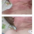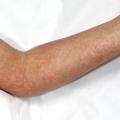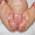 - chez les sujets atteints d’eczéma, une surinfection à HSV rend compte du syndrome de Kaposi-Juliusberg (ou eczema herpeticum), responsable d’une aggravation brutale de l’atteinte cutanée avec présence de vésiculo-pustules et érosions arrondies confluentes d’évolution croûteuse, d’un état général altéré et d’une fièvre élevée (fig. 5) ; le traitement repose sur un traitement antiviral par aciclovir par voie systémique et le plus souvent par une antibiothérapie à visées antistreptococcique et antistaphylococcique ;
