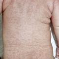 - éruptions roséoliformes (qui ressemblent à la roséole syphilitique), érythème discret fait de petits éléments rosés mal délimités avec de larges intervalles de peau saine ;