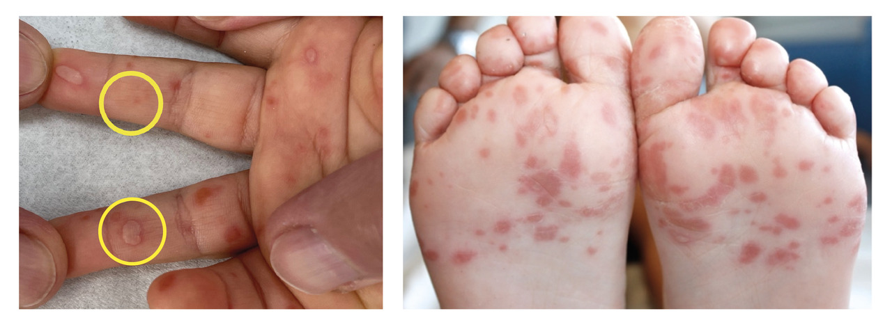 À la différence d’autres exanthèmes peu spécifiques associés à certains entérovirus, le syndrome pieds-mains-bouche est suffisamment caractéristique cliniquement pour affirmer un diagnostic étiologique : éruption vésiculeuse avec des vésicules ovalaires grisâtres cernées d’un halo érythémateux situées au niveau des paumes des mains et des plantes des pieds (