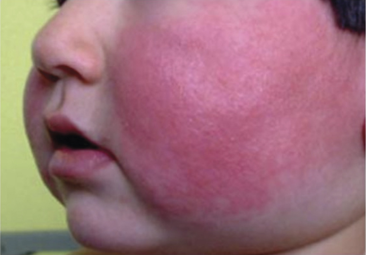 La primo-infection par le parvovirus B19, qui appartient à la famille de Parvoviridae, touche essentiellement les enfants entre l’âge de 4 et 10 ans. L’incubation est de quatre à quatorze jours ; les personnes ne sont plus contagieuses dès que l’éruption apparaît. Celle-ci débute au niveau du visage par des plaques rouge vif, donnant un aspect de « joues souffletées » (L’état général est conservé, la fièvre est modérée ou absente. Les signes associés peuvent être articulaires (arthralgies) ou hématologiques.