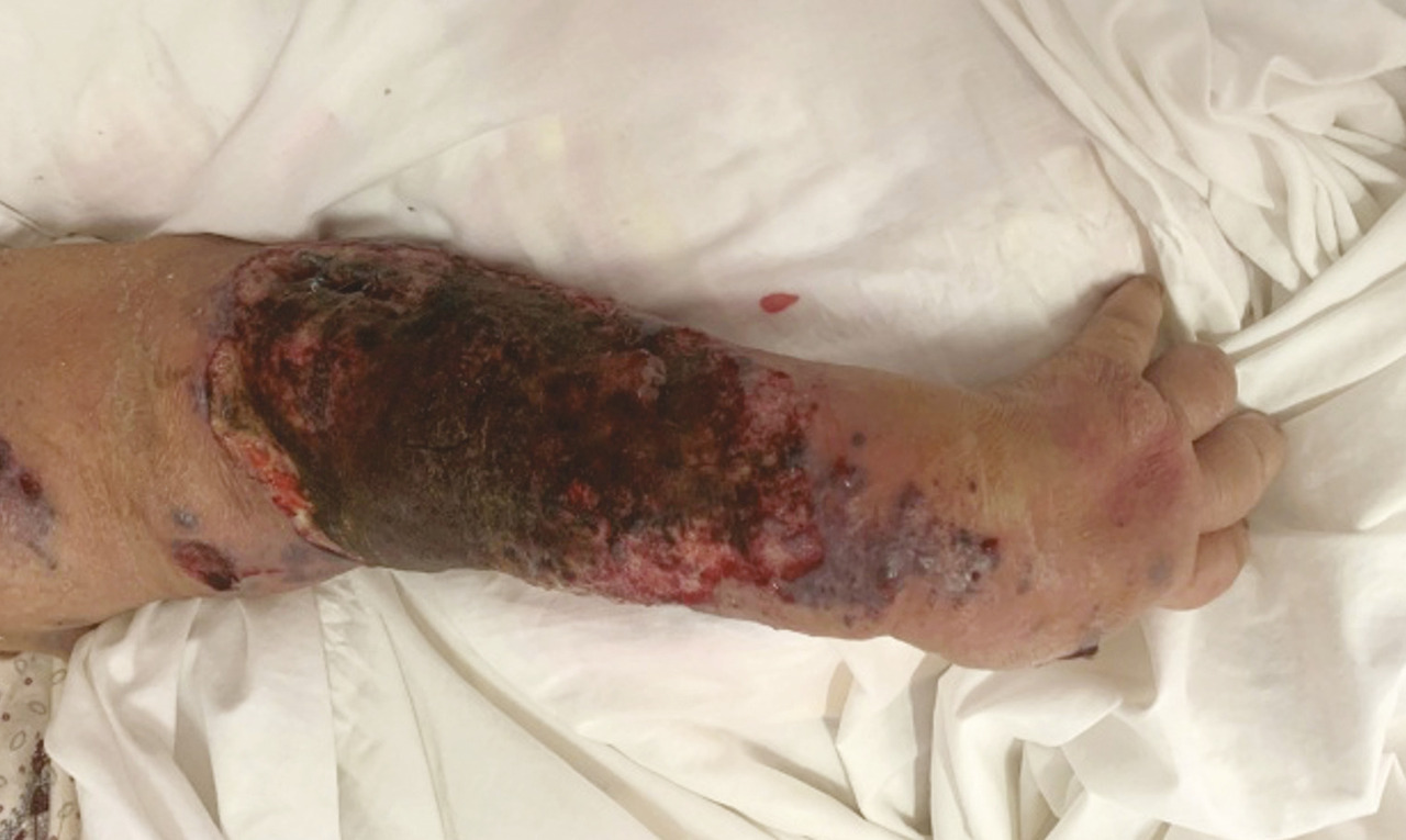Après quelques jours de traitement immunosuppresseur, une douleur intense et insomniante s’installe, avec érythème et tuméfaction du membre supérieur gauche. Les examens complémentaires retrouvent une protéine C-réactive (CRP) à 300 mg/L, des hémocultures stériles, une échographie Doppler artérioveineuse sans thrombose. Le diagnostic d’une dermohypodermite bactérienne non nécrosante est évoqué dans un premier temps. La patiente est alors traitée par antibiothérapie (amoxicilline et acide clavulanique). L’évolution est défavorable, avec apparition de lésions nécrotico-hémorragiques rapidement extensives (