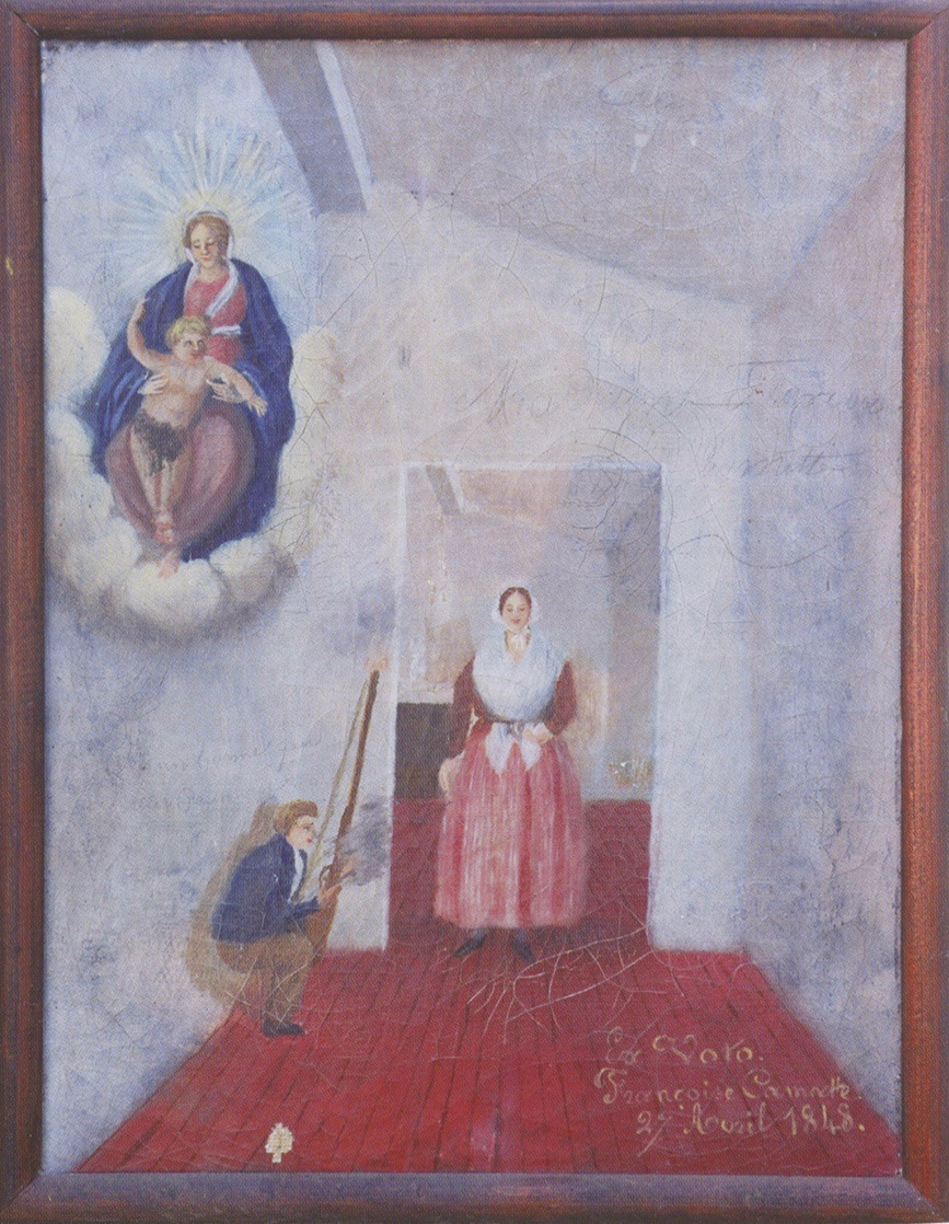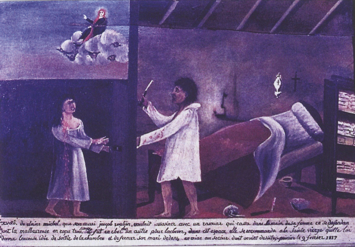 Le langage de l’inscription montre qu’il s’agit d’un couple plutôt fruste : « ex-voto de Claire Michel que son mari Joseph Roubin voulait assassiner avec un rasouar qui cassa dans la main de sa femme en se détendant dont la malheureuse en reçu trois coups il fut en chercher un autre pour l’achever dans cet espace elle se recommanda a la sainte vierge quelle lui donna leureuse idée de sortir de la chambre et de fermer son mari dedans, en crian au secour dont on vint desuite ; peinier le 9 février 1817 ». Mais si le rendu artistique n’est pas excellent, la composition est subtile.