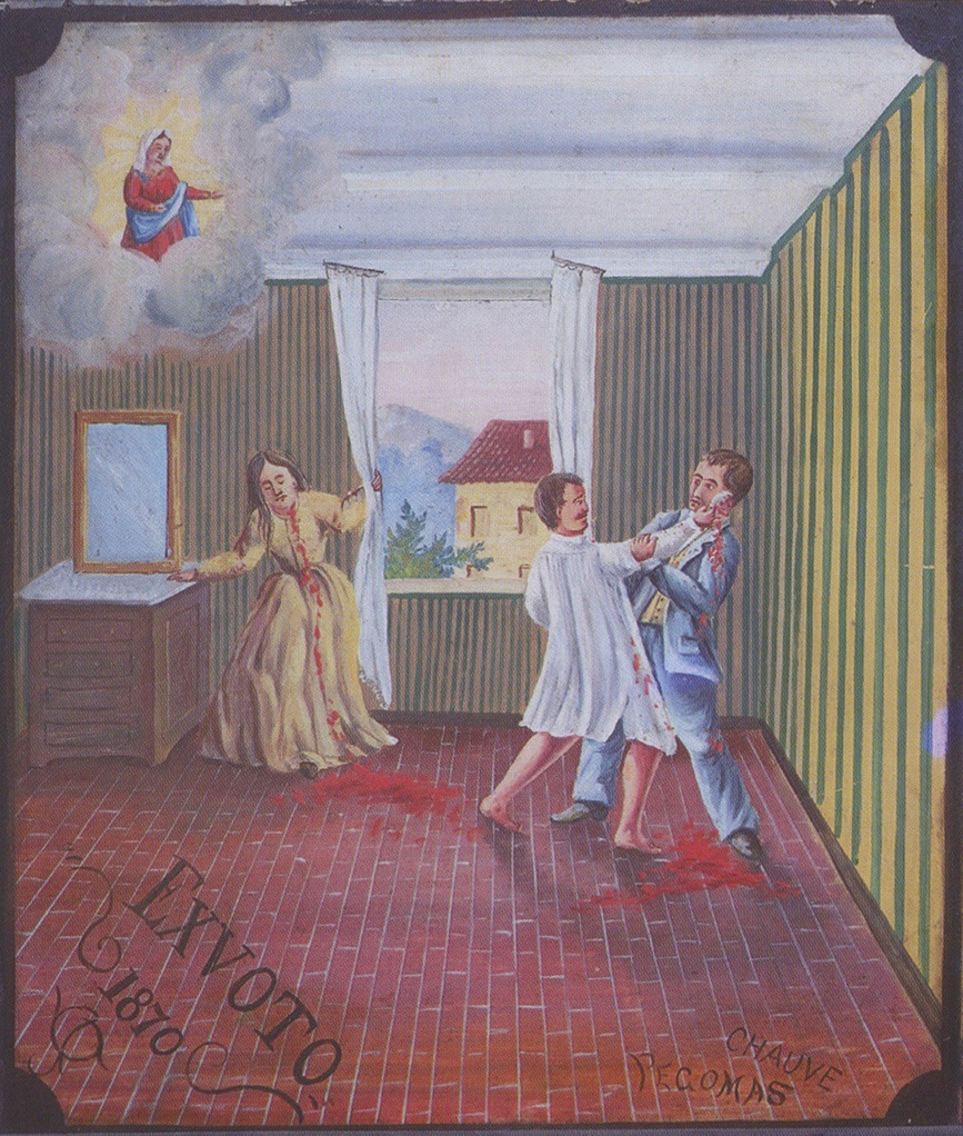 Un alcoolisme chronique est probable chez le mari, vu sa violence connue de tous ; si nous ne savons pas l’heure du drame, on constate qu’il fait grand jour, et probablement déjà chaud dans les vignes ; et d’après le récit, les enfants, qui ne sont pas à l’école, devraient y être. De telles scènes de ménage violentes sont fréquentes et favorisées par la consommation d’alcool, et dans cette famille le malheur veut que le père de famille soit habituellement armé pour l’exercice de son métier : la serpette professionnelle s’est transformée en une arme par destination. Honoré Chauve, jardinier, frappe sa femme à la gorge, puis égorge aussi, dit la presse, deux de leurs filles. Seule la cadette échappe à la mort grâce à l’intervention de Raymond Chauve, voisin et probablement parent, venu en entendant les cris. Blessé lui-même à l’oreille, il en réchappe grâce à la Vierge, et c’est lui qui fait peindre l’ex-voto.