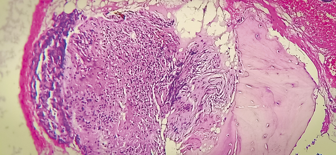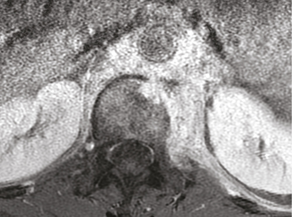 Cet homme de 53 ans consultait pour une douleur de la charnière dorsolombaire à irradiation antérieure, mal calmée par les antalgiques, avec un amaigrissement sans fièvre. L’examen clinique trouvait une raideur rachidienne et le bilan biologique montrait un syndrome inflammatoire. La tomodensitométrie (TDM) abdominale révélait une fibrose rétropéritonéale avec lyse de L1 (fig. 1 ). L’imagerie par résonance magnétique (IRM) montrait un aspect de fibrose rétropéritonéale secondaire, en hyposignal T1 et T2, se rehaussant après injection du gadolinium avec lyse de L1 (fig. 2 ). La tomographie par émission de positons au 18-fluorodésoxyglucose (TEP18-FDG) montrait un hypermétabolisme intense de L1 dont la biopsie scannoguidée révélait un granulome épithélio-giganto-cellulaire cadrant avec une tuberculose (fig. 3 ). Le patient était efficacement traité par les antibacillaires pendant 9 mois.