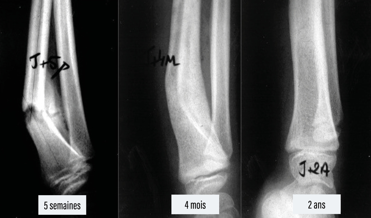 - les pseudarthroses, exceptionnelles chez l’enfant. Il s’agit souvent d’un simple retard de consolidation qu’il suffit de traiter par une immobilisation un peu plus longue pour obtenir la consolidation. Elles peuvent parfois être expliquées par un abord chirurgical extensif et peu respectueux des structures périostées ;