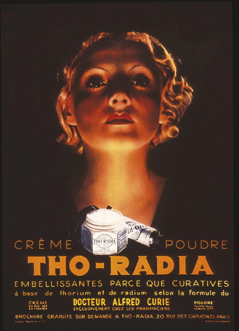 En parallèle, le radium s’infiltra largement dans les produits de beauté : on ne compta bientôt plus les crèmes, lotions et autres poudres se vantant d’être radioactives : Iradium, les crèmes Activa, Microradium, Radiobust, Alpha Radium… Le summum fut atteint avec les produits de la gamme Tho-Radia, dont l’indéniable succès s’est étalé sur plusieurs décennies, des années 1930 aux années 1960 (