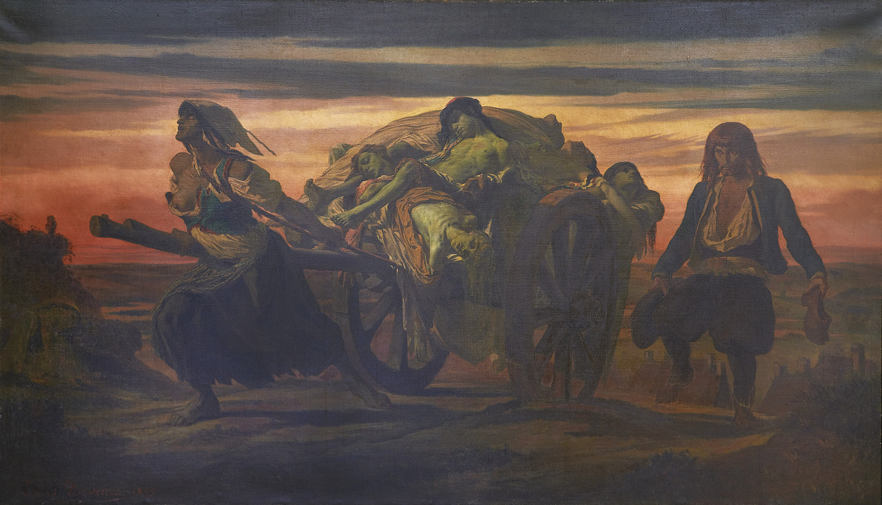 On ne représente pas la peste, mais ses conséquences immédiates : la mort inéluctable et les amoncellements de cadavres. L’image du tombereau transportant les cadavres traverse les époques et illustre avec une grande acuité la préoccupation première des sociétés : la gestion des corps. On se méfie des morts et de leurs odeurs nauséabondes qui charrient autant de miasmes. Aussi, l’urgence est à l’ensevelissement des cadavres et à l’impérieuse nécessité d’agrandir les cimetières, comme le précisent de nombreuses chartes. Il est important de noter, par ailleurs, que dans les textes anciens le mot « peste » désigne de nombreuses maladies et non pas nécessairement la peste au sens où on l’entend aujourd’hui (Yersinia pestis). En revanche, lorsqu’il est question de « corruption moult périlleuse » ou de « grant et excessive mortalité », l’évocation de la démesure permet de s’assurer qu’il est bien question de la grande peste. Le tableau de Louis Duveau (fig. 1 ) illustre une scène du Barzaz Breiz, recueil de chants bretons collectés par Théodore de La Villemarqué en 1839. Dans La Peste d’Elliant, une femme tire une charrette dans laquelle gisent, entassés, les corps de ses neufs enfants, tous morts de la peste. Son mari la suit en sifflant : il a perdu la raison. Cette tragédie a inspiré l’artiste pour dépeindre une mort collective, fatalité devant laquelle on reste impuissant.