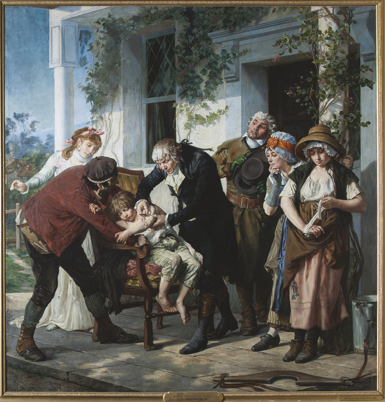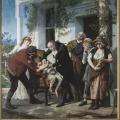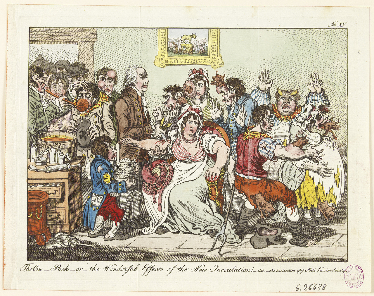 Les portraits de savants ou de médecins à l’œuvre sont une thématique récurrente de l’histoire de l’art, dès l’Antiquité. Celle-ci connaît un regain d’intérêt au XIXe siècle avec les avancées de la médecine. Elle accède ainsi au rang de peinture d’histoire, dont les héros modernes sont animés par la rationalité scientifique au service du progrès. Le tableau de Gaston Mélingue, conservé à l’Académie nationale de médecine, constitue un bel exemple de ce retour de la science sur le devant de la scène (fig. 3 ). Cet hommage à Edward Jenner, découvreur de la vaccine en 1796, représente de façon théâtrale le moment où le médecin anglais s’apprête à pratiquer son art. Mélingue peint ce tableau au début de la Troisième République, à un moment où la puissance publique s’empare des questions de santé et de progrès social. Il fait œuvre d’historien près d’un siècle après la découverte majeure de Jenner, mettant un terme (provisoire) à la variole. Mais les progrès de la médecine n’arrivent pas sans contestations et angoisses, qui s’expriment notamment à travers la caricature (fig. 4 ). Le procédé de la vaccine, assez contre-intuitif, devient l’objet de peurs irrationnelles. Dans l’espoir de le protéger d’un mal plus grand, on inocule le virus d’un animal, celui de la vache, à un être humain. La crainte d’être transformé en vache trouve un écho jusque dans les réflexions du philosophe Emmanuel Kant, qui parle même de « minautorisation ».