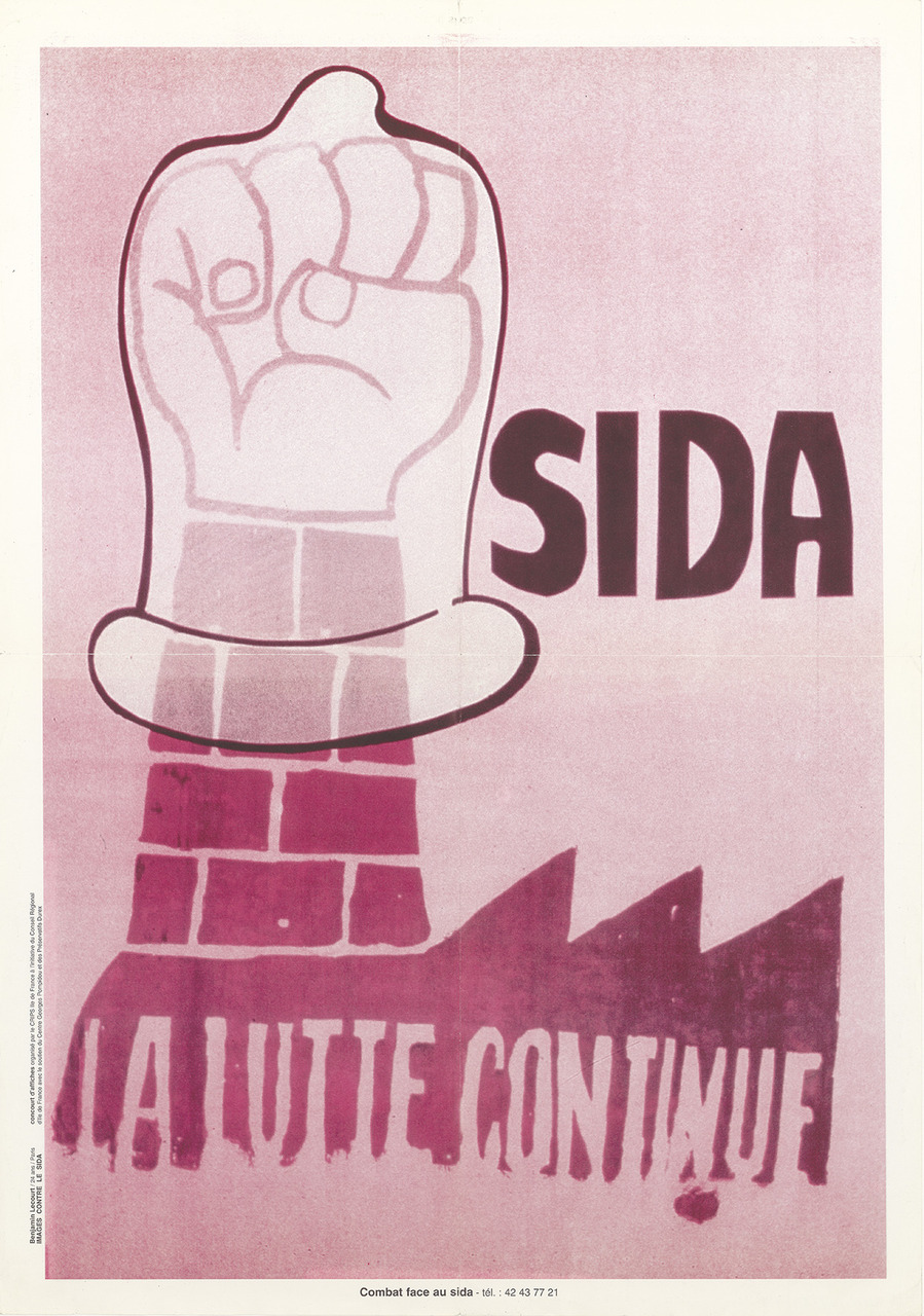 Néanmoins, l’apparition du virus de l’immunodéficience humaine (VIH)/syndrome de l’immunodéficience acquise (sida) en 1981 vient mettre un coup d’arrêt à cette utopie. Le monde culturel paie un lourd tribut au VIH/sida entre 1981 et 1996. Comme un écho à la Peste noire, la question de la représentation des corps malades, des souffrances, du deuil à laquelle s’ajoutent la sérophobie, l’homophobie et le racisme est prégnante. Comment traduire le vaste sentiment d’impuissance, de chagrin et de colère qui saisit une partie de la société des années 1980 ? À mi-chemin entre l’art et l’activisme, des collectifs d’artistes et des associations de malades s’emparent du discours militant et marquent la création graphique. Leurs objectifs : alerter, prévenir mais aussi lutter pour une reconnaissance des droits des malades et de la communauté homosexuelle. Avec une résonance particulière, cette affiche puise dans les productions de l’atelier des Beaux-Arts de Paris en mai 1968 (