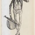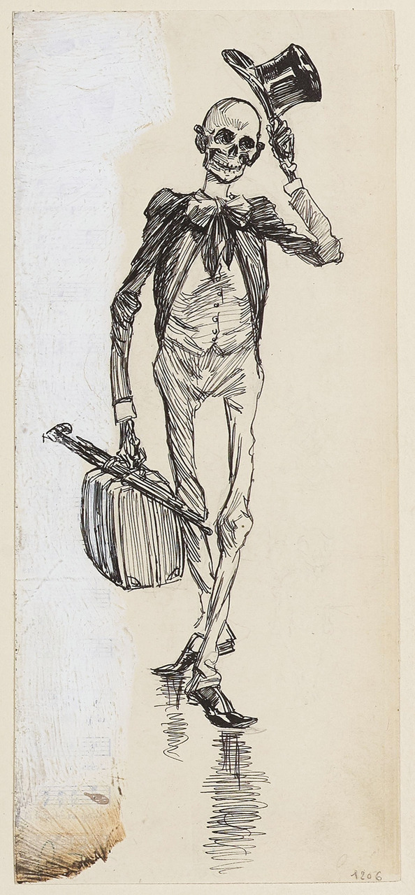 En 1832, le choléra prend le relais de la peste dans la terreur qu’il inspire. La rumeur de son arrivée est annoncée dans la presse nouvellement libérée sous Louis-Philippe. Bientôt, l’État est accusé de vouloir se débarrasser des pauvres. On se méfie d’ailleurs des classes laborieuses, et les hygiénistes, dont les théories prennent de plus en plus d’importance au XIXe siècle, ne sont jamais assez durs envers les chiffonniers accusés d’être des agents de propagation du choléra. Thaumaturge, la famille royale se rend au chevet des malades à l’Hôtel-Dieu dans un tableau d’Alfred Johannot aux tonalités propagandistes conservé au musée Carnavalet. À mesure que les épisodes de choléra se multiplient, les artistes s’emparent du sujet. Dans une volonté assumée de distanciation ironique, Théophile Alexandre Steinlen personnifie le choléra en voyageur dandy et squelettique qui profite du train pour se répandre de ville en ville (fig. 5 ).
