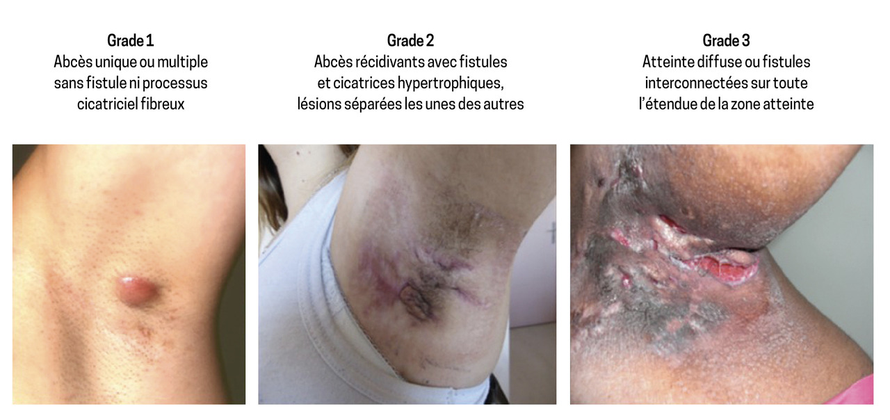 - la présence de lésions typiques, c’est-à-dire des nodules profonds douloureux ou abcédés, des trajets fistuleux, des cicatrices fibreuses en pont et des comédons ouverts ;