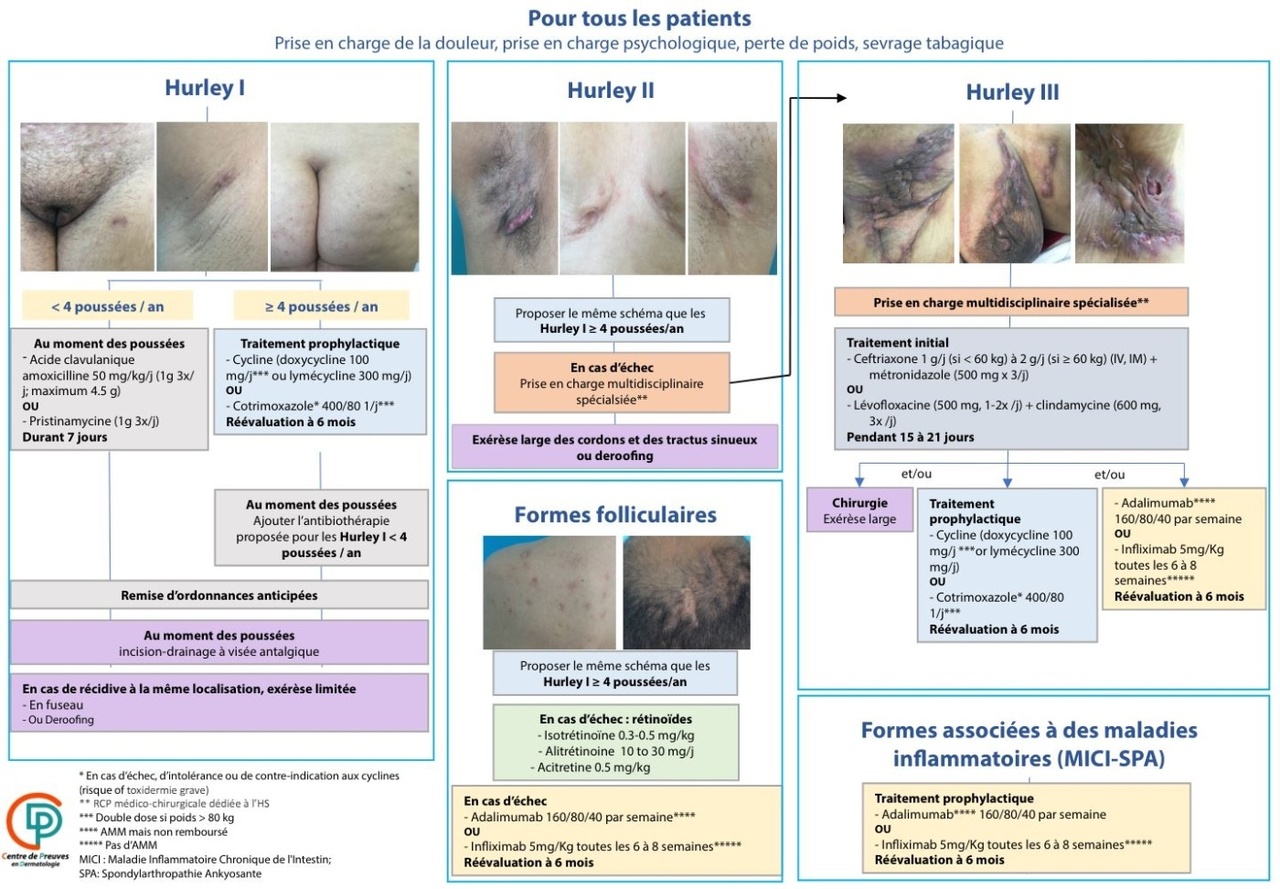 Les dernières recommandations européennes publiées en 2024 distinguent les formes inflammatoires des formes non inflammatoires. En fonction de la sévérité cotée selon l’IHS4, plusieurs options thérapeutiques sont proposées : antibiothérapie (tétracyclines, clindamycine), biothérapie (adalimumab, sécukinumab ou bimékizumab), traitement hormonal.