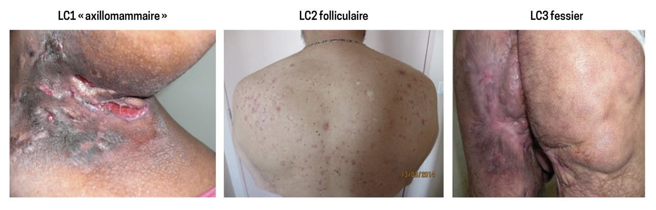 - le phénotype « folliculaire » (26 %), ou LC2, avec des atteintes axillaires, mammaires, rétro-auriculaires, thoraciques et dorsales et une probabilité élevée de développer des lésions folliculaires (kystes épidermiques, comédons, sinus pilo-nidal). Cette forme sévère est plus fréquente chez les hommes fumeurs ;