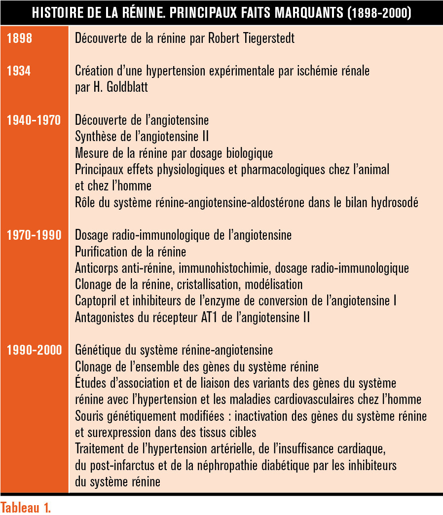 Il a fallu plusieurs décennies pour décrypter l’ensemble des différents constituants du système rénine. La contribution de physiologistes, biochimistes, chimistes, pharmacologues, biologistes moléculaires et cliniciens-chercheurs a permis d’aboutir au schéma classique du système rénine-angiotensine tel qu’il est enseigné aujourd’hui aux étudiants et décrit dans les manuels de physiologie et de pharmacologie. C’est sur ces bases que repose l’utilisation en thérapeutique des inhibiteurs du système rénine-angiotensine. De nouveaux apports au système dit « classique » sont apparus mais ils ne seront pas discutés ici car leur contribution à l’ensemble reste encore à préciser. Notre histoire couvrira la période s’étendant de la mise en évidence initiale d’un effet hypertenseur du rein (1898) jusqu’aux années 2000 (v. tableau 1).
