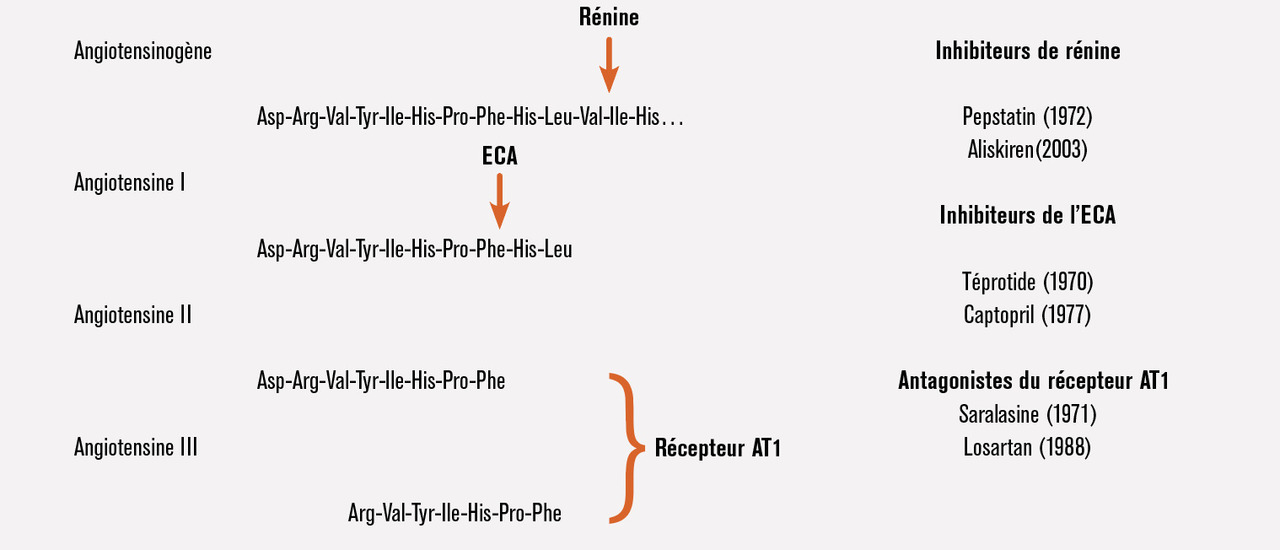 Une nouvelle classe thérapeutique d’antihypertenseurs naît, celle des inhibiteurs du système rénine- angiotensine. Elle est radicalement différente des classes déjà existantes : diurétiques, ganglioplégiques, inhibiteurs du système nerveux sympathique, antihypertenseurs centraux, vasodilatateurs, bêtabloquants. Elle est fondée sur une hypothèse physiopathologique bien spécifique, le blocage du système rénine-angiotensine. La conception des inhibiteurs résulte des connaissances sur les molécules impliquées dans la cascade de réactions enzymatiques aboutissant à la production d’angiotensine II (fig. 1). Le blocage peut se faire au niveau de la rénine ou de l’enzyme de conversion de l’angiotensine I, ou encore au niveau du récepteur AT1 de l’angiotensine II. Ce tournant de la recherche pharmacologique a demandé du temps et s’est fait progressivement, certains étant sceptiques sur l’intérêt de l’inhibition du système rénine-angiotensine ou en limitant l’indication aux hypertensions sévères à rénine haute et aux hypertensions rénovasculaires. Pourtant, Page théorise dès 1958 que « la possibilité d’agir sur la rénine, c’est-à-dire de prévenir ou de contrôler la formation d’angiotensine, ou d’agir sur l’enzyme de conversion de l’angiotensine I pour contrôler la formation d’angiotensine II mérite d’être étudiée ». Il faudra attendre le début des années 1970 pour que soit synthétisée la saralasine, le premier antagoniste peptidique du récepteur de l’angiotensine II. C’est un peptide dérivé de l’angiotensine II dont le dernier acide aminé est substitué par une alanine. La saralasine abaisse la pression artérielle dans l’hypertension rénovasculaire chez le rat, et un « test à la saralasine » est pratiqué en clinique pour savoir si une hypertension artérielle est ou non « dépendante » de la rénine. Toutefois, cet inhibiteur a l’inconvénient de mimer en partie les effets de l’angiotensine II du fait d’un effet agoniste partiel. Le test à la saralasine sous- estime la participation de la rénine au niveau tensionnel en cas de bilan sodé positif et sera abandonné.