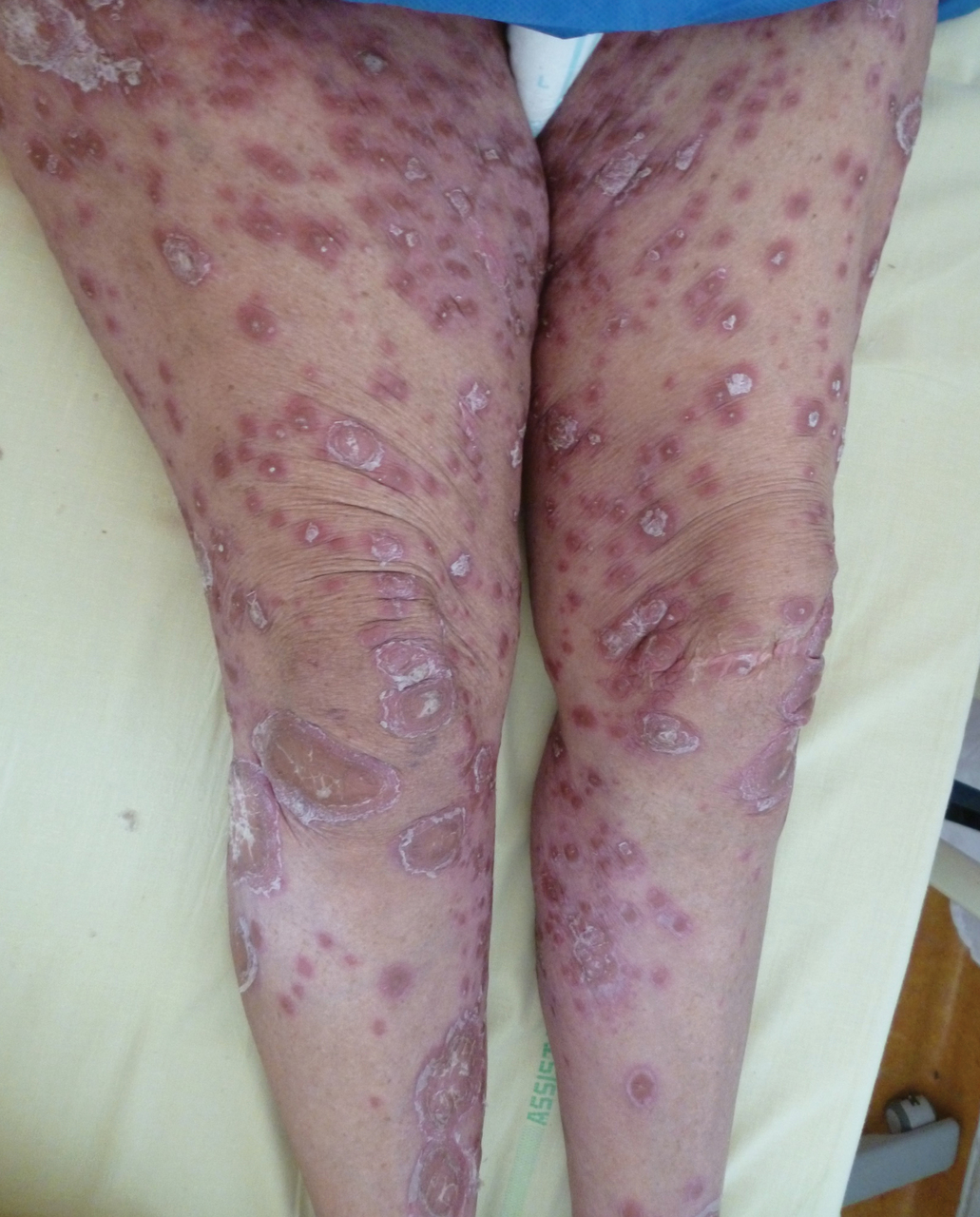 L’examen note des plaques érythématosquameuses diffuses sur les jambes, avec atteinte du cuir chevelu et kératodermie palmoplantaire, évocatrices d’un psoriasis pustuleux.