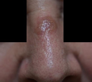 Une femme de 60 ans consulte pour une lésion du dos du nez évoluant depuis environ un an. Il s’agissait initialement d’une banale macule érythémateuse, par la suite épaissie.