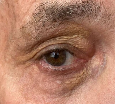 On voit sur la photo un xanthélasma, atteinte évocatrice de la maladie d’Erdheim-Chester, qui fait partie du spectre des histiocytoses clonales. L’infiltration du sillon atrioventriculaire en est une manifestation quasi pathognomonique, et l’atteinte des artères rénales est très classique.