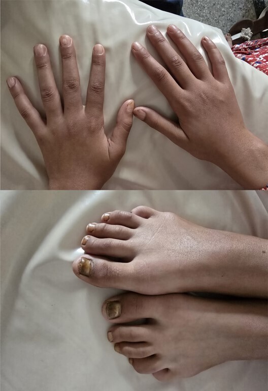 Une jeune fille de 13 ans consulte pour une altération progressive des ongles des orteils évoluant depuis environ 5 mois. Aucun antécédent de traumatisme, de pathologie dermatologique ou systémique n’est rapporté. L’hygiène est correcte. L’examen montre une dystrophie unguéale avec coloration brun-jaune, un épaississement, friabilité et une hyperkératose sous-unguéale, intéressant principalement les gros orteils, de manière bilatérale.