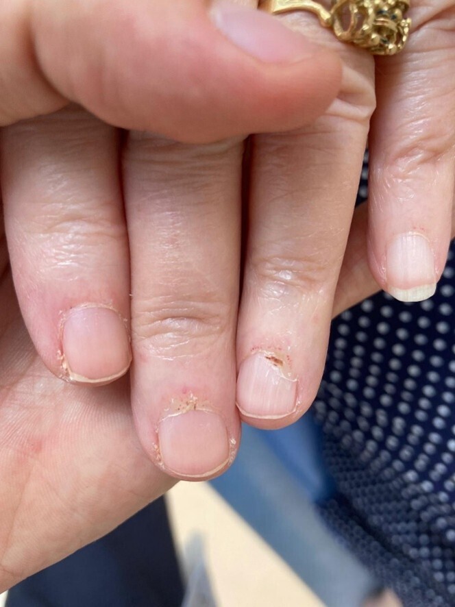 Vous constatez un signe de la manucure qui associe un érythème inflammatoire et squameux proche du lit de l’ongle avec une dilatation des capillaires, visibles à l’œil nu. Cet aspect se rencontre au cours des dermatomyosites. La dyspnée et la faiblesse musculaire font suspecter une atteinte pulmonaire interstitielle associée et une forme myositique.