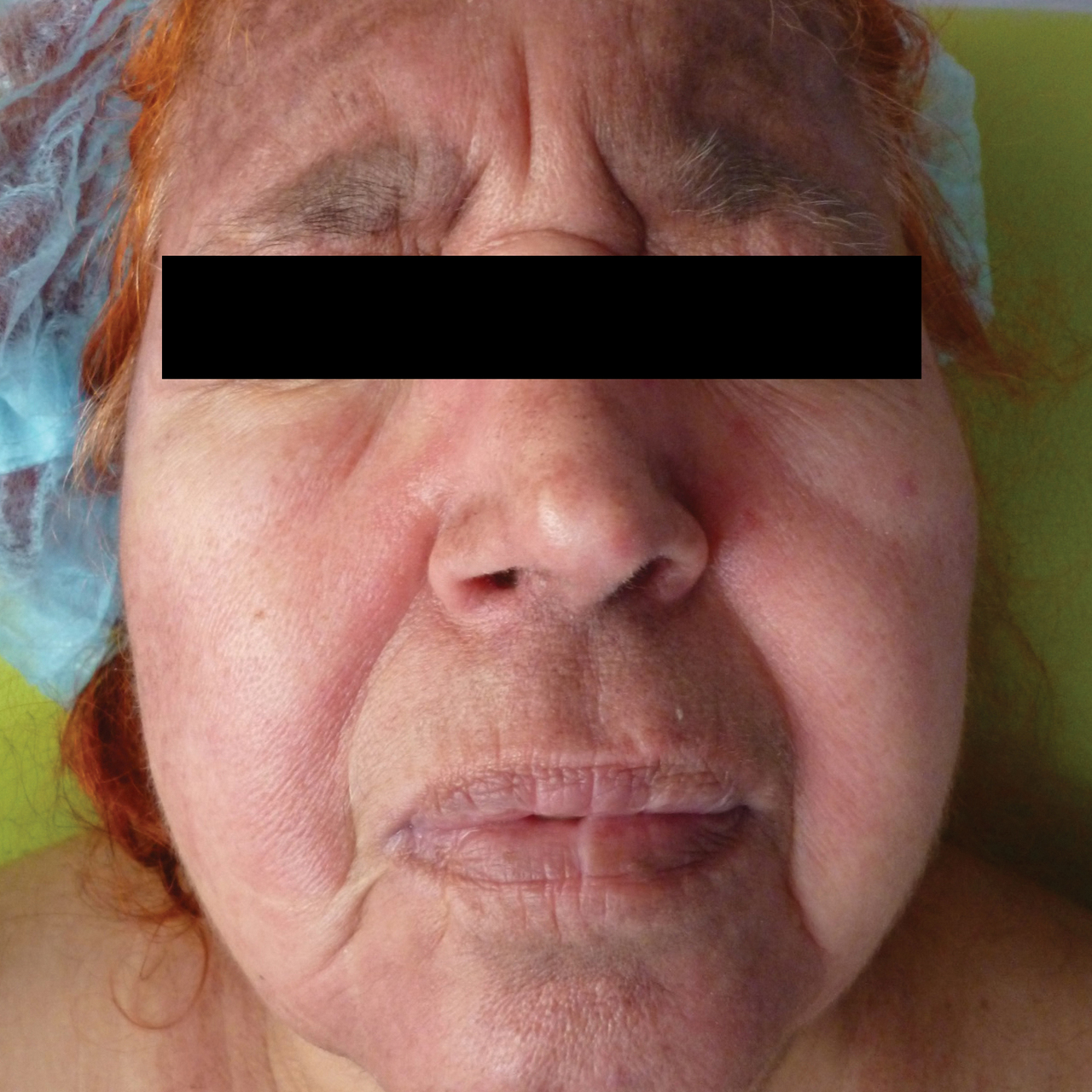Une femme de 68 ans consulte pour une éruption du visage et une faiblesse musculaire.