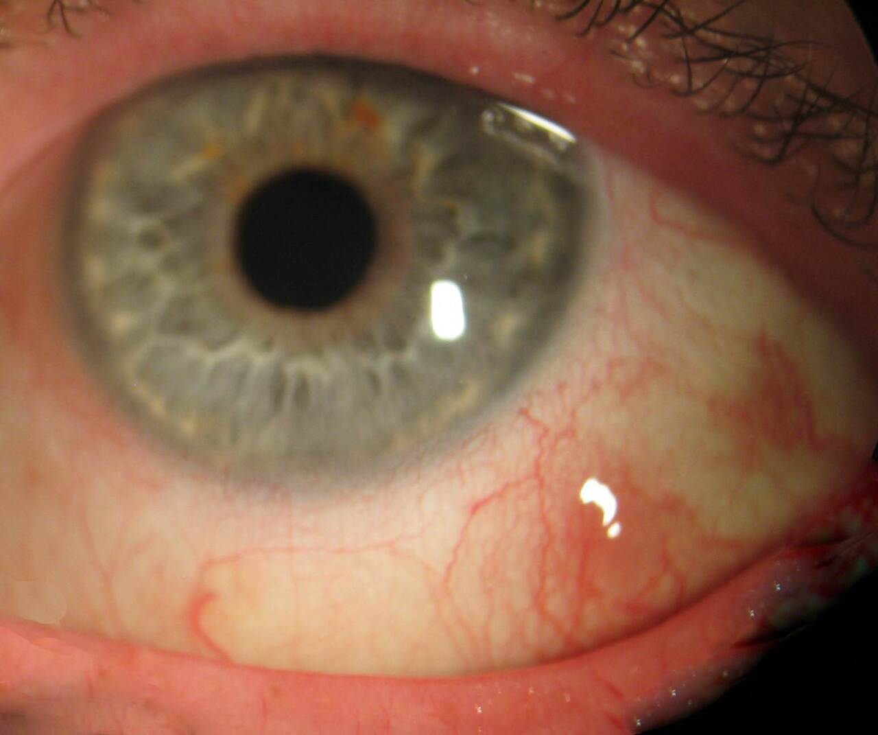Madame D., 46 ans, consulte pour une rougeur oculaire gauche apparue depuis deux semaines et augmentant progressivement. L’œil est de plus en plus douloureux. L’anamnèse rapporte la notion d’un épisode similaire de moindre importance et moins douloureux quelques années auparavant, spontanément résolutif. Il n’y a pas d’altération visuelle. L’examen est normal par ailleurs. Elle n’est pas traitée.