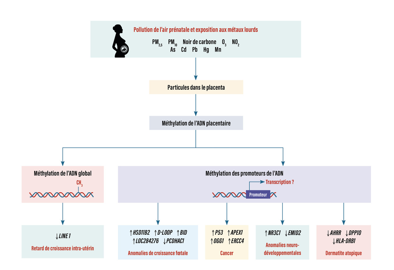 Les particules de pollution atmosphérique présentes dans le placenta peuvent modifier les fonctions placentaires en altérant le méthylome de l’ADN, qui joue un rôle de médiateur dans l’activation et l’extinction transcriptionnelles des gènes impliqués dans divers processus physiologiques et développementaux.