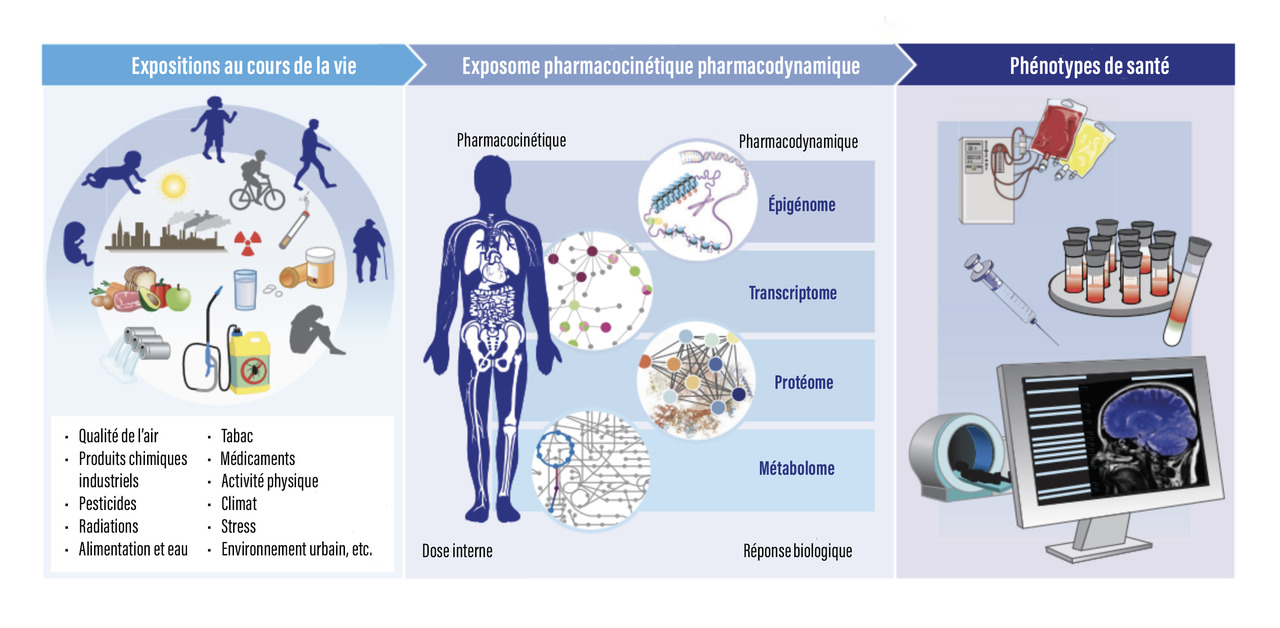 En 2005, Christopher Wild a défini l’exposome comme la totalité des expositions auxquelles un individu est soumis de la conception à la mort. C’est une représentation complexe et dynamique des expositions auxquelles une personne est sujette tout au long de sa vie, intégrant l’environnement chimique, microbiologique, physique, récréatif, médicamenteux, le style de vie, l’alimentation, ainsi que les infections.