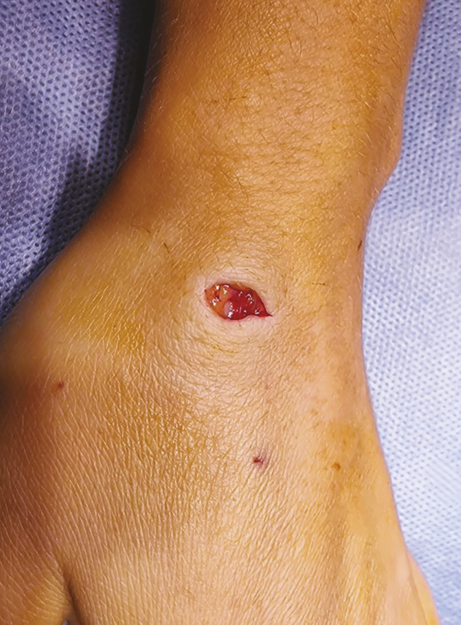 Les morsures de chat sont moins fréquentes (4 %). Les germes retrouvés sont identiques avec, au premier plan, Pasteurella multocida.7 Les morsures sont souvent punctiformes, avec une inoculation profonde des germes (fig. 4 ).