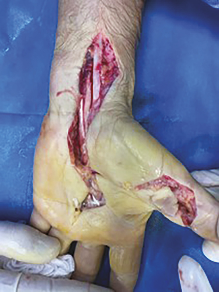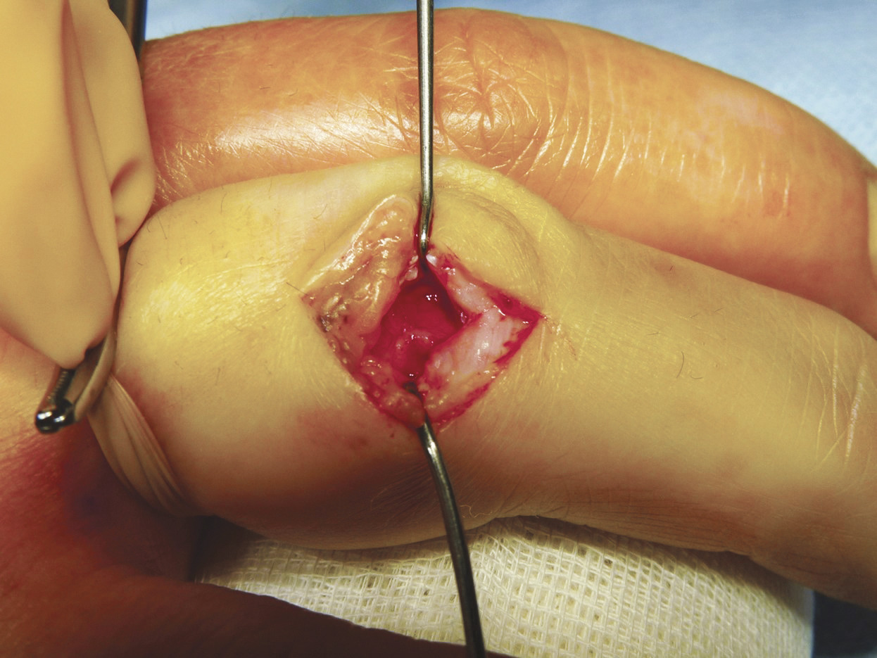 Au stade 3 (fig. 2 ), les tendons fléchisseurs sont atteints sévèrement, parfois nécrosés. La mobilisation du doigt est impossible. Le traitement chirurgical d’emblée est urgent. L’excision des tissus infectés et nécrotiques doit être « carcinologique » et peut conduire à ce stade à une excision tendineuse, dont les séquelles sont gravissimes, même en cas de tentative de reconstruction à distance. En cas d’évolution tardive ou défavorable, l’amputation peut s’avérer nécessaire.