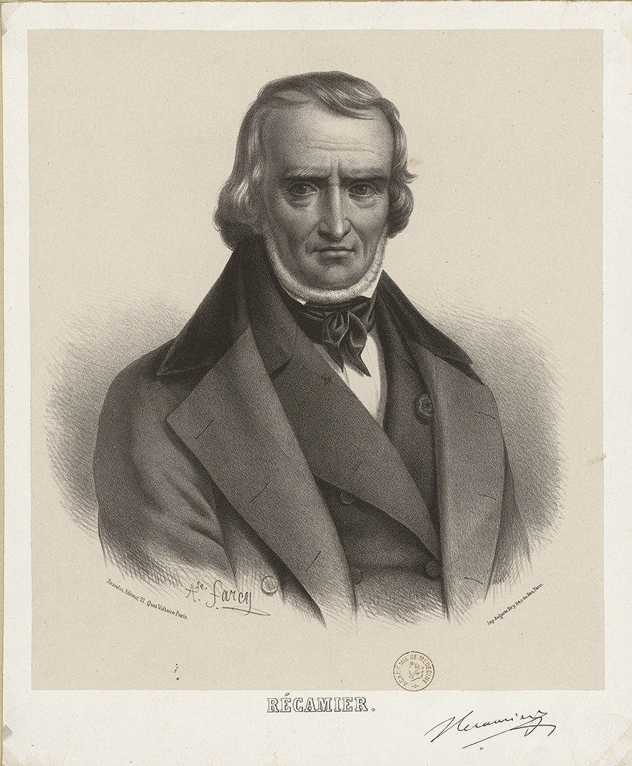 Lointain cousin de Juliette Récamier, Joseph Claude Anthelme Récamier naquit le 6 novembre 1774 à Rochefort-en-Bugey, dans l’Ain. Étant donné les incertitudes du temps, son père, notaire royal, le dirigea vers la médecine, profession considérée alors comme plus sûre que la sienne. Il commença ses études à l’hôpital de Belley dont les médecins formaient des étudiants au lit des malades. Il y rencontra Richerand (1779-1840) qui lui donna le goût de la chirurgie. En 1793, Récamier fut réquisitionné comme sous-major à l’armée des Alpes de Kellermann. Affecté pendant un an à l’hôpital de Bourg-en-Bresse, il y fit la connaissance de Bichat (1771-1802), avec lequel il se lia d’amitié. Puis il entra dans la marine, où il servit jusqu’en 1796, et après un bref séjour à Lyon il alla à Paris en 1797. La Révolution ayant mis à bas toutes les institutions médicales dont la faculté, qui était, il est vrai, bien vermoulue,1 une nouvelle organisation de la médecine et de la chirurgie tant en ce qui concernait les études que leur exercice se mit en place de façon très remarquable grâce en particulier à Fourcroy (1755-1809). Sous l’inspiration de Bichat et de Dupuytren (1777-1835) en 1796 se créa la Société médicale d’émulation dont Bichat fut le premier et Récamier le troisième secrétaire général. Il devint avec Dupuytren l’élève des chirurgiens Boyer (1757-1833) et surtout Corvisart (1755-1821) qui se voulait essentiellement thérapeute. En 1799, Réca-mier se présenta au concours de la toute nouvelle École pratique, il en remporta le grand prix et passa sa thèse de doctorat. Médecin suppléant de l’Hôtel-Dieu, il fut nommé médecin en chef en 1806, médecin et non chirurgien.