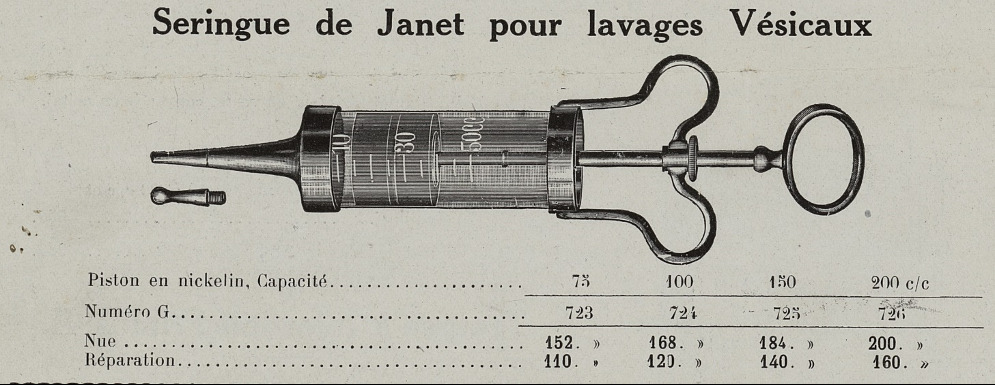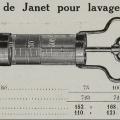 Sur le plan chirurgical aussi, Janet a innové. Il a inventé divers outils et appareils médicaux à destination diagnostique et/ou thérapeutique, tels le siphon-laveur aseptique et l’appareil-élévateur pour injections dit « du Dr Janet » associé à son propre stérilisateur et de nombreux autres instruments qui portent son nom : le dilatateur cylindroconique du Dr Janet, le cathéter et béniqué conique, la sonde cannelée à manche, le stylet à manche, la canule avec bout en platine, la canule en métal nickelé à jet récurrent, le bistouri droit, courbe et demi-courbe à olive du Dr Janet, l’écarteur méatique extensible trivalve, la valve urétrale du Dr Janet, le trajectome du Dr Janet, la bougie en gomme à olive double, la porte-pommade courbe, la pince urétrale à coulisse, la canule cystoscopique pour les glandes et, avant tout, la légendaire seringue urétrale stérilisable du Dr Janet (fig. 4).5,14,15