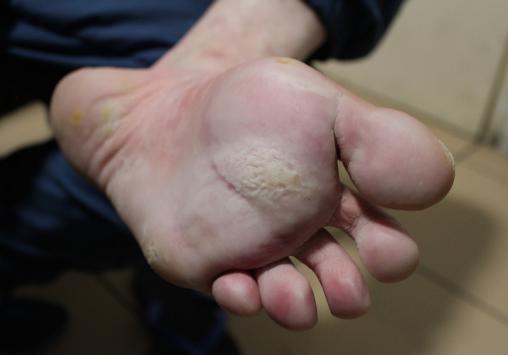 Léonard, 33 ans, consulte pour des sensations de brûlure et une odeur désagréable des pieds (figure ). Il reconnaît un manque d’hygiène (il est sans domicile fixe) et utilise des chaussures de seconde main avec lesquelles il marche beaucoup.