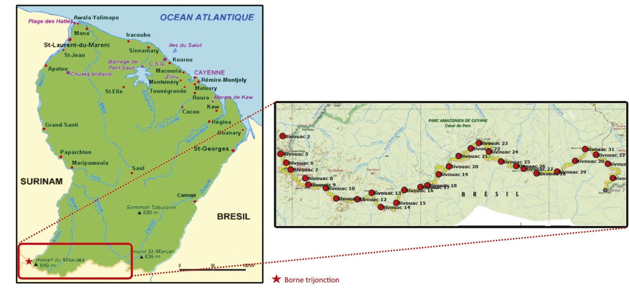 La frontière sud de la Guyane s’étend d’ouest en est, de la borne tri-jonction à la source du fleuve Oyapock sur 320 km. L’éloignement de ce désert vert rendant difficile le ravitaillement, la traversée de cette région n’a jamais été réalisée d’une seule traite par une expédition, y compris celles chargées de l’arbitrage de démarcation de la frontière. Ainsi, certains tronçons ont été reconnus, en y accédant par les cours d’eau, laissant de côté les portions les plus difficiles pour des extrapolations fondées sur des photographies aériennes.