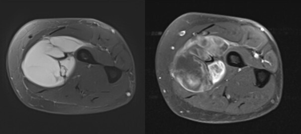 Concernant les tumeurs des membres, on distingue premièrement les lésions graisseuses, qui sont majoritairement représentées par les lipomes bénins. Ces lésions ne nécessitent pas d’examen complémentaire si elles ont une taille inférieure à 5 cm en situation profonde (intramusculaire) ou 10 cm en situation superficielle (dans la graisse sous-cutanée au-dessus des fascias musculaires). Au-dessus de cette limite de taille, il est recommandé de réaliser une imagerie par résonance magnétique (IRM), à la recherche de signes d’atypie. L’objectif est de reconnaître les potentiels liposarcomes et les tumeurs graisseuses atypiques (liposarcomes bien différenciés). Dans les autres cas de figure, c’est-à-dire pour les tumeurs non graisseuses, ou les pseudotumeurs, ou pour les tumeurs osseuses qui ne sont pas aisément caractérisables, le recours à l’IRM doit être systématique (figure). Certaines lésions restent d’orientation difficile, et il est de rigueur de prôner la prudence en envoyant le patient dans un centre expert et/ou en organisant une surveillance radioclinique. Pour inciter à la prudence, on évoque volontiers les cas souvent décrits des lésions sarcomateuses prises par erreur pour des hématomes et les radiographies normales des sarcomes osseux de l’enfant au stade précoce. Une évolution clinique péjorative doit être systématiquement accompagnée d’une investigation radiologique par IRM.